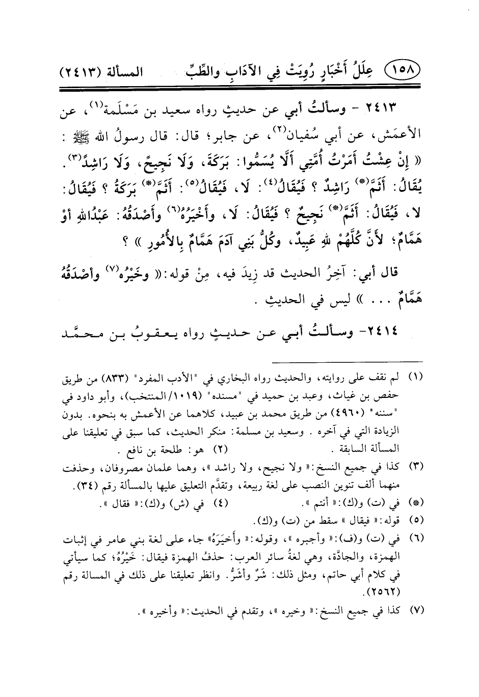 ٢٤١٣ - وسألتُ أَبِي عَنْ حديثٍ رَوَاهُ سَعِيدُ بْنُ مَسْلَمة (١) ، عَنِ الأعمَش، عَنْ أَبِي سُفيان (٢) ، عَنْ جَابِرٍ؛ قال: قال رسولُ الله (ص) : إِنْ عِشْتُ أَمَرْتُ أُمَّتِي أَلَاّ يُسَمُّوا: بَرَكَةَ، وَلَا نَجِيحً، وَلَا رَاشِدً (٣) .