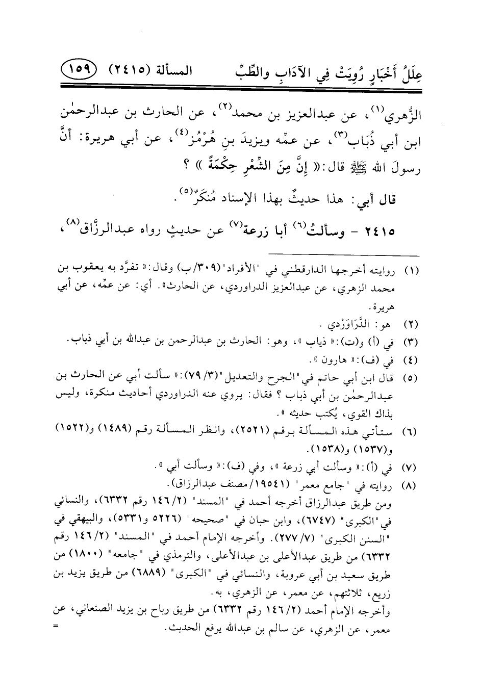 ٢٤١٥ - وسألتُ (٦) أَبَا زُرْعَةَ (٧) عن حديثٍ رواه عبد الرزَّاق (٨) ،