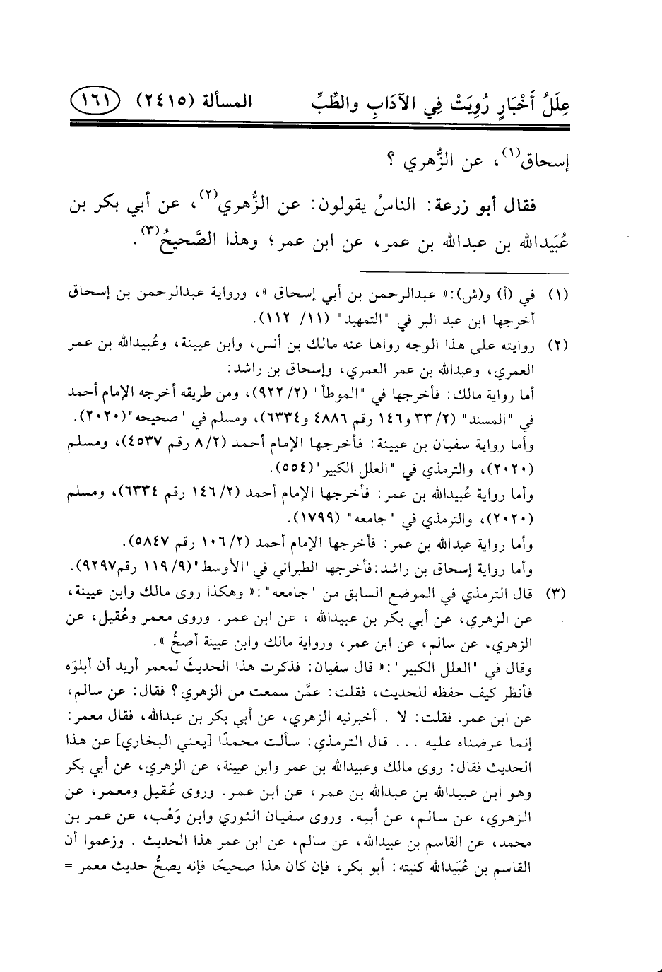 فَقَالَ أَبُو زُرْعَةَ: الناسُ يقولون: عَنِ الزُّهري (٢) ، عن أبي بكر بن عُبَيدالله بن عبد الله ابْنِ عُمَرَ، عَنِ ابْنِ عُمَرَ؛ وهذا الصَّحيحُ (٣) .