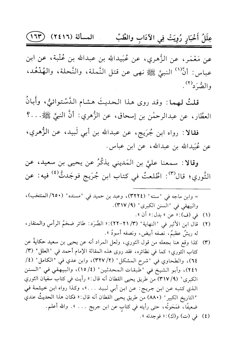 عَنْ مَعْمَر، عَنِ الزُّهري، عَنْ عُبَيدالله بن عبد الله بْنِ عُتْبة، عَنِ ابْنِ عَبَّاسٍ: أنَّ (١) النبيَّ (ص) نَهَى عَنْ قَتْلِ النَّملة، والنَّحلة، والهُدْهُد، والصُّرَد (٢) .
