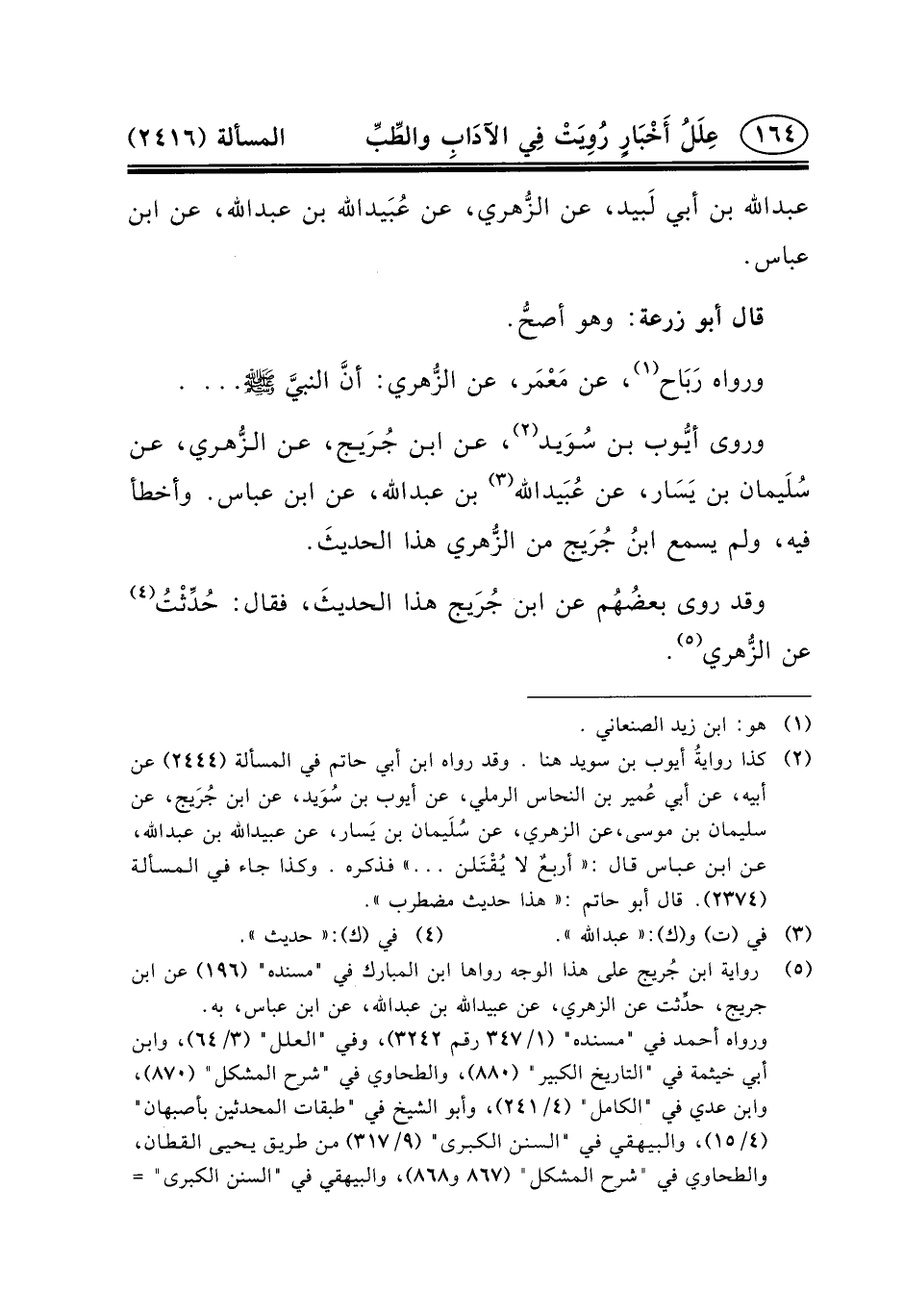 (٢) كذا روايةُ أيوب بن سويد هنا. وقد رواه ابن أبي حاتم في المسألة (٢٤٤٤) عن أبيه، عَنْ أَبِي عُمير بْنِ النَّحَّاسِ الرَّمْلِيِّ، عَنْ أَيُّوبَ بْنِ سُوَيد، عَنِ ابْنِ جُرَيج، عَنْ سُلَيْمَانَ بْنِ مُوسَى، عَنِ الزُّهْرِيِّ، عَنْ سُلَيمان بن يَسار، عن عبيد الله بن عبد الله، عَنِ ابْنِ عَبَّاسٍ قَالَ: = = «أربعٌ لا يُقْتَلن ... » فذكره. وكذا جاء في المسألة (٢٣٧٤) . قال أبو حاتم: «هذا حديث مضطرب» .