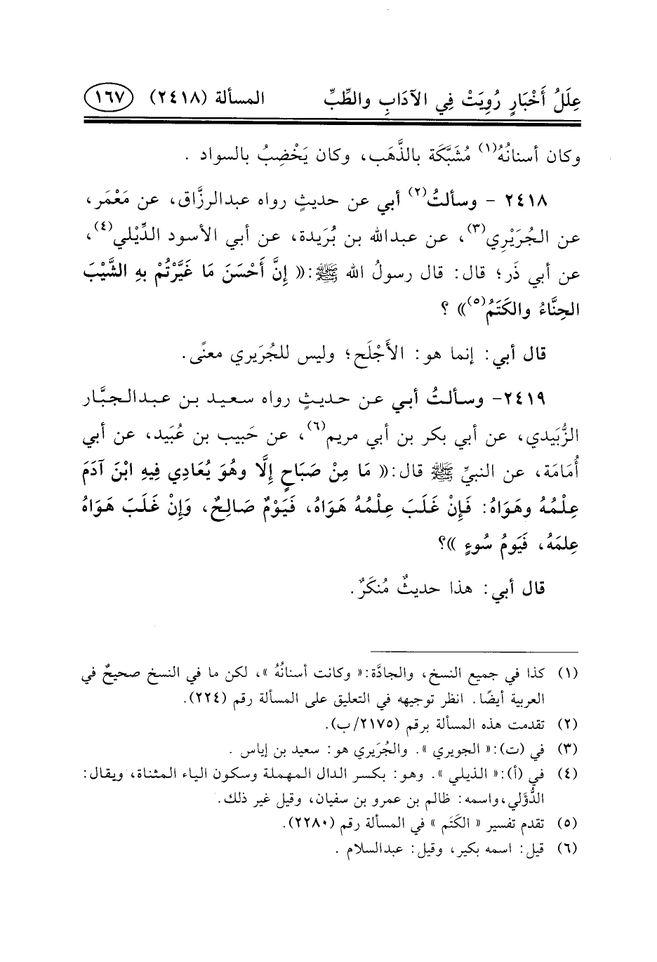 ٢٤١٨ - وسألتُ (٢) أَبِي عَنْ حديثٍ رواه عبد الرزَّاق، عَنْ مَعْمَر، عَنِ الجُرَيْرِي (٣) ، عَنْ عبد الله بن بُرَيدة، عَنْ أَبِي الأَسْوَدِ الدِّيْلي (٤) ، عَنْ أَبِي ذَر؛ قَالَ: قَالَ رسولُ الله (ص) : إِنَّ أَحْسَنَ مَا غَيَّرْتُمْ بهِ الشَّيْبَ الحِنَّاءُ والكَتَمُ (٥) ؟