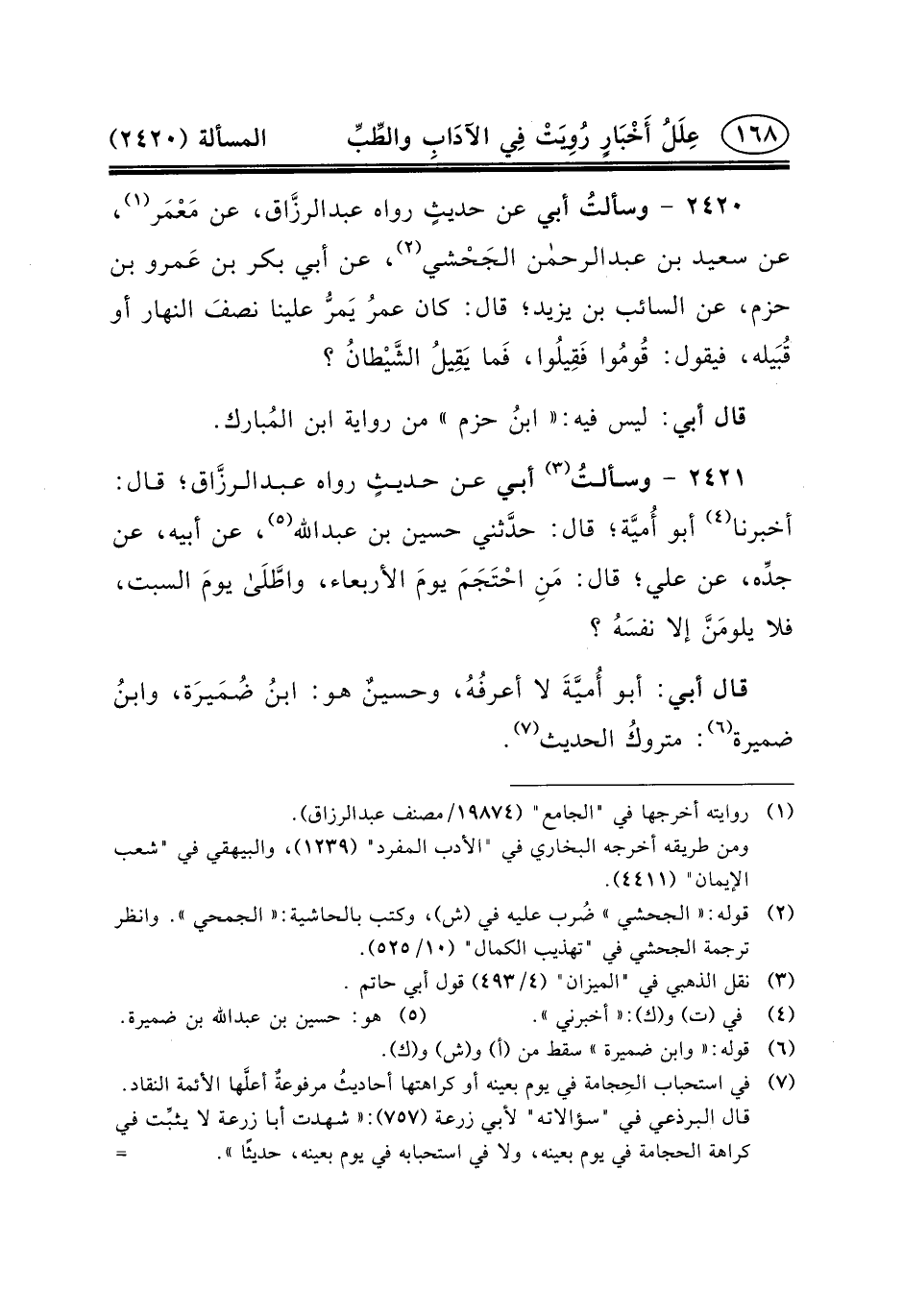 ٢٤٢٠ - وسألتُ أَبِي عَنْ حديثٍ رَوَاهُ عبد الرزَّاق، عَنْ مَعْمَر (١) ،