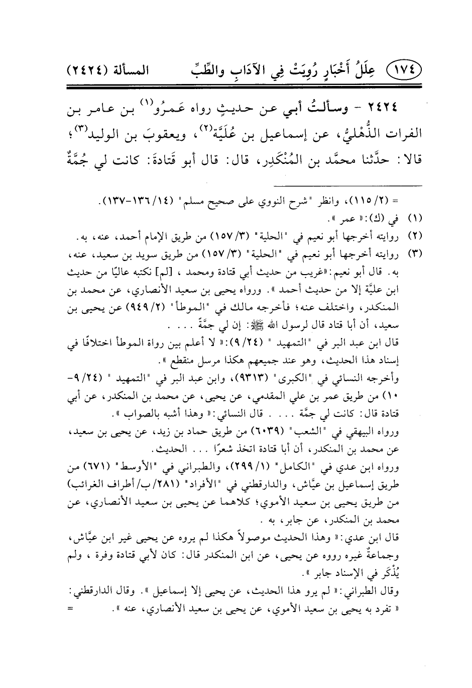 ٢٤٢٤ - وسألتُ أَبِي عَنْ حديثٍ رَوَاهُ عَمرُو (١) بْنُ عَامِرِ بْنِ الْفُرَاتِ الذُّهْليُّ، عن إسماعيل بن عُلَيَّة (٢) ، ويعقوبَ بْنِ الْوَلِيدِ (٣) ؛