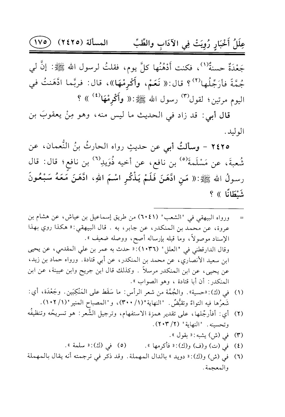 ٢٤٢٥ - وسألتُ أَبِي عَنْ حديثٍ رَوَاهُ الحارثُ بنُ النُّعمان، عَنْ شُعبةَ، عن مَسْلَمةَ (٥) ابن نافع، عن أخيه ذُوَيدِ (٦) بْنِ نافعٍ؛ قَالَ: قَالَ رسولُ الله (ص) : مَنِ ادَّهَنَ فَلَمْ يَذْكُرِ اسْمَ اللهِ، ادَّهَنَ مَعَهُ سَبْعُونَ شَيْطَانًا؟