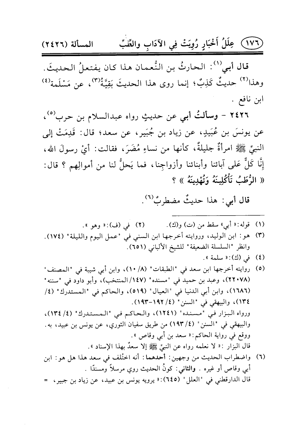٢٤٢٦ - وسألتُ أَبِي عَنْ حديثٍ رواه عبد السلام بْنُ حَرْبٍ (٥) ، عَنْ يونسَ بْنِ عُبَيدٍ، عَنْ زِيَادِ بْنِ جُبَير، عَنْ سَعْدٍ؛ قَالَ: قَدِمَتْ إِلَى النبيِّ (ص) امرأةٌ جليلةٌ، كَأَنَّهَا مِنْ نساءِ مُضَرَ، فَقَالَتْ: أيْ رسولَ اللَّهِ، إِنَّا كَلٌّ عَلى آبائنا وأبنائنا وأزواجِنا، فَمَا يَحلُّ لَنَا مِنْ أموالِهم؟ قال: الرُّطَبُ تَأْكُلِينَهُ وَتُهْدِينَهُ؟