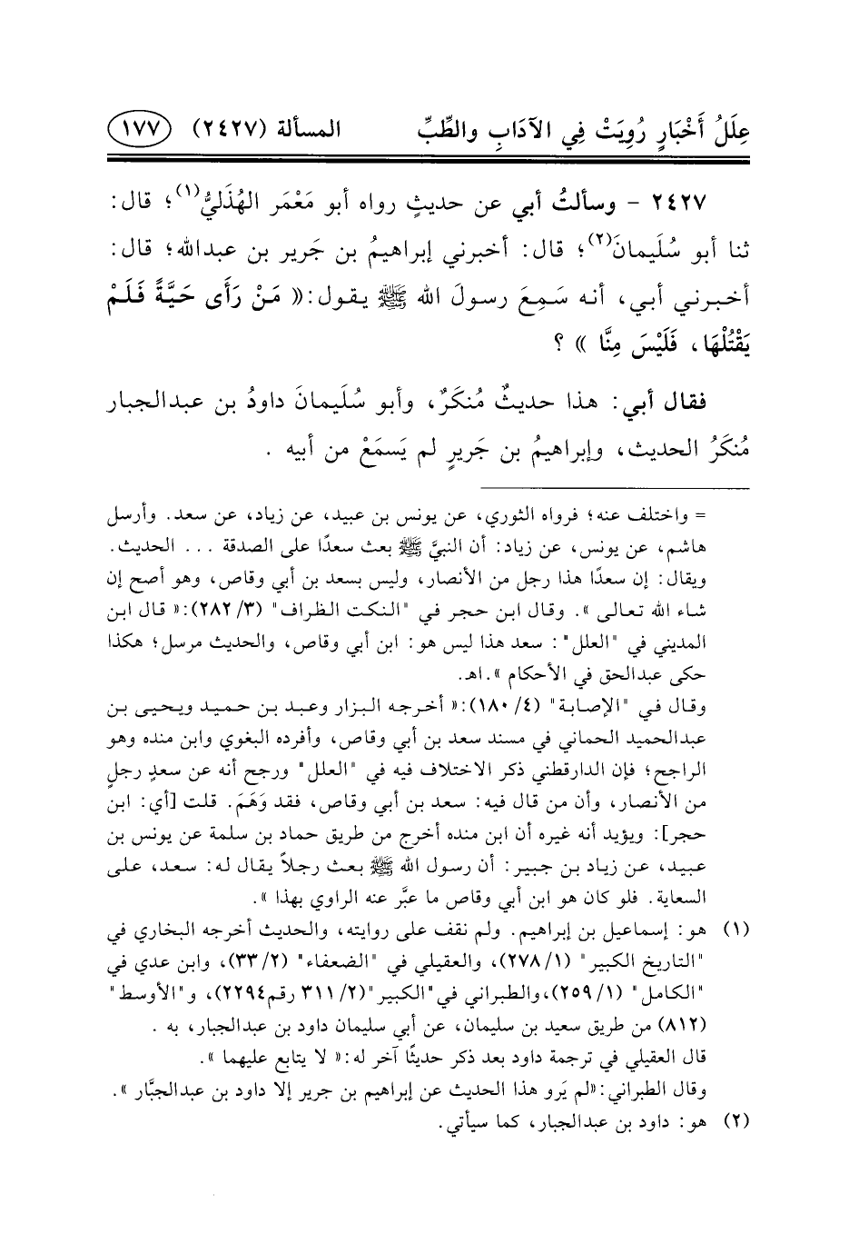 ٢٤٢٧ - وسألتُ أَبِي عَنْ حديثٍ رَوَاهُ أبو مَعْمَر الهُذَليُّ (١) ؛ قال: ثنا أَبُو سُلَيمانَ (٢) ؛ قَالَ: أَخْبَرَنِي إبراهيمُ بن جَرير بن عبد الله؛ قال: أخبرني أَبِي، أَنَّهُ سَمِعَ رسولَ اللَّهِ (ص) يَقُولُ: مَنْ رَأَى حَيَّةً فَلَمْ يَقْتُلْهَا، فَلَيْسَ مِنَّا؟