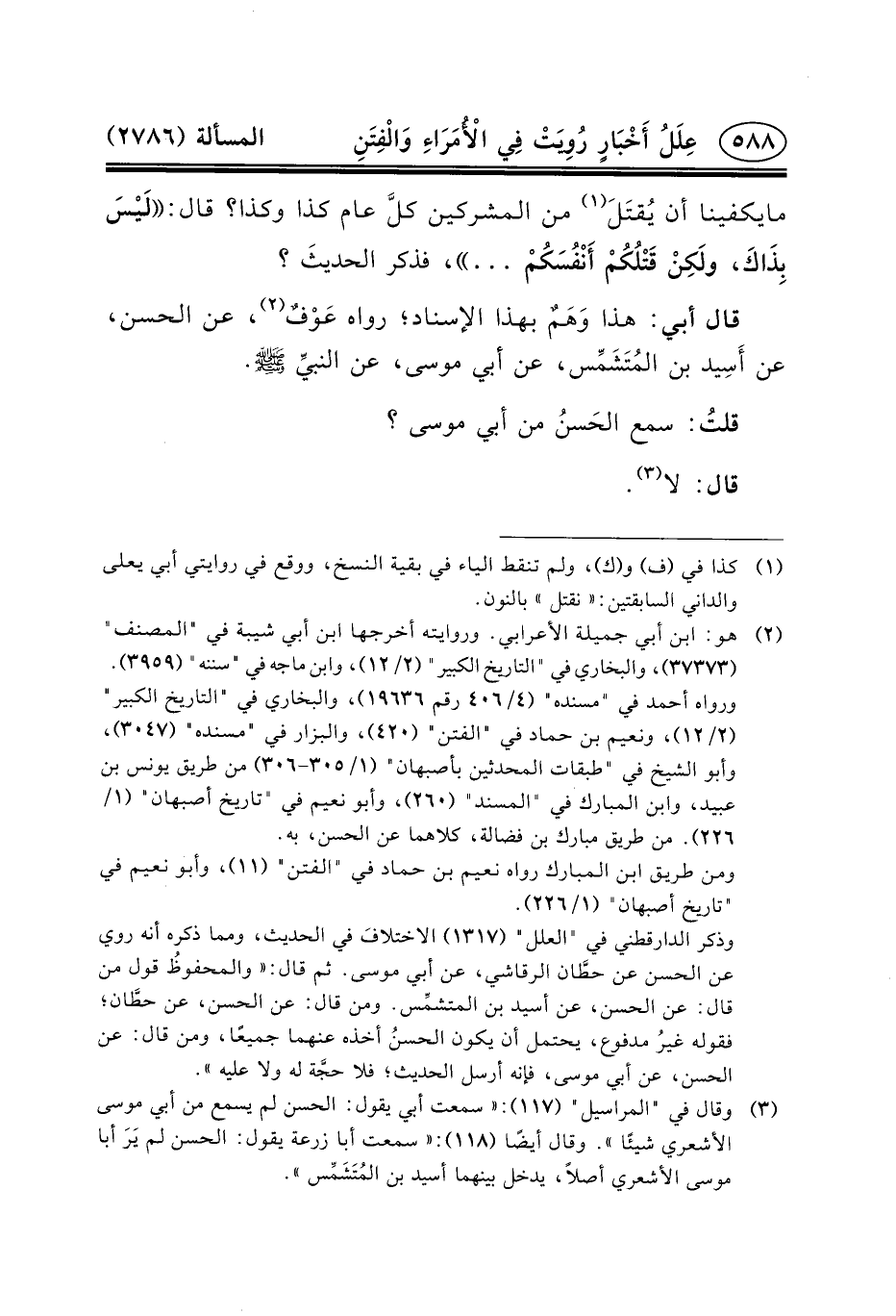 (٣) وقال في "المراسيل" (١١٧) : «سمعت أبي يقول: الْحَسَنَ لَمْ يَسْمَعْ مِنْ أَبِي موسى الأشعري شيئًا» . وقال أيضًا (١١٨) : «سمعت أبا زرعة يقول: الحسن لم يَرَ أبا موسى الأشعري أصلاً، يدخل بينهما أسيد بن المُتَشَمِّس» .