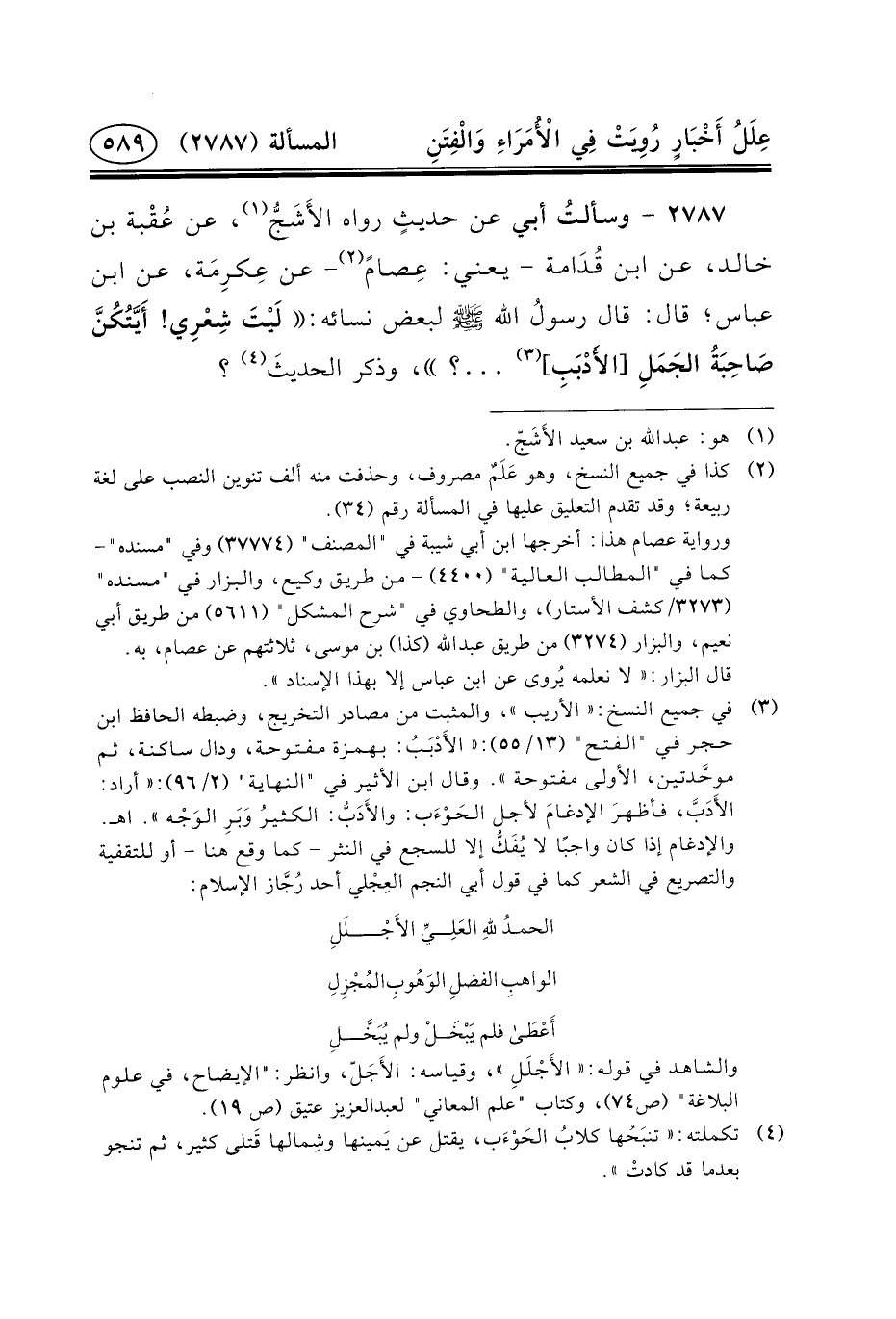 ٢٧٨٧ - وسألتُ أَبِي عَنْ حديثٍ رَوَاهُ الأَشَجُّ (١) ، عَنْ عُقْبة بْنِ خَالِدٍ، عَنِ ابْنِ قُدَامة - يَعْنِي: عِصامً (٢) - عَنْ عِكرِمَة، عَنِ ابْنِ عَبَّاسٍ؛ قال: قال رسولُ الله (ص) لِبَعْضِ نِسَائِهِ: لَيْتَ شِعْرِي! أَيَّتُكُنَّ صَاحِبَةُ الجَمَلِ [الأَدْبَبِ] (٣) ... ؟ ،
