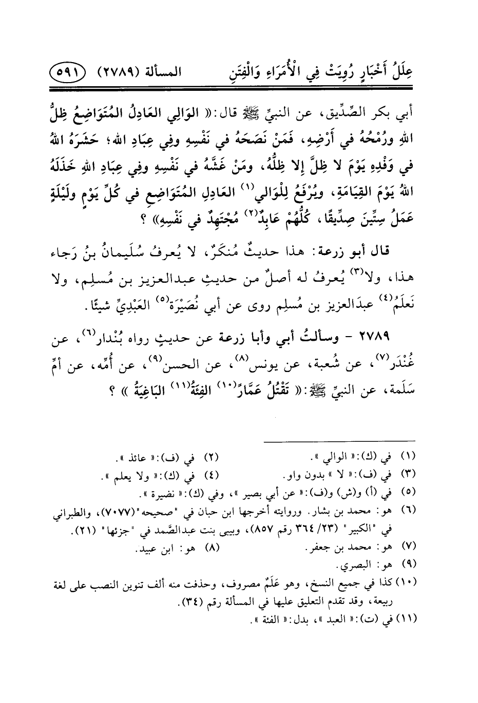 ٢٧٨٩ - وسألتُ أَبِي وَأَبَا زُرْعَةَ عَنْ حديثٍ رَوَاهُ بُنْدار (٦) ، عَنْ غُنْدَر (٧) ، عَنْ شُعبة، عَنْ يُونُسَ (٨) ، عَنِ الحَسَنِ (٩) ، عَنْ أُمِّه، عَنْ أمِّ سَلَمة، عن النبيِّ (ص) : تَقْتُلُ عَمَّارً (١٠) الفِئَةُ (١١) البَاغِيَةُ؟