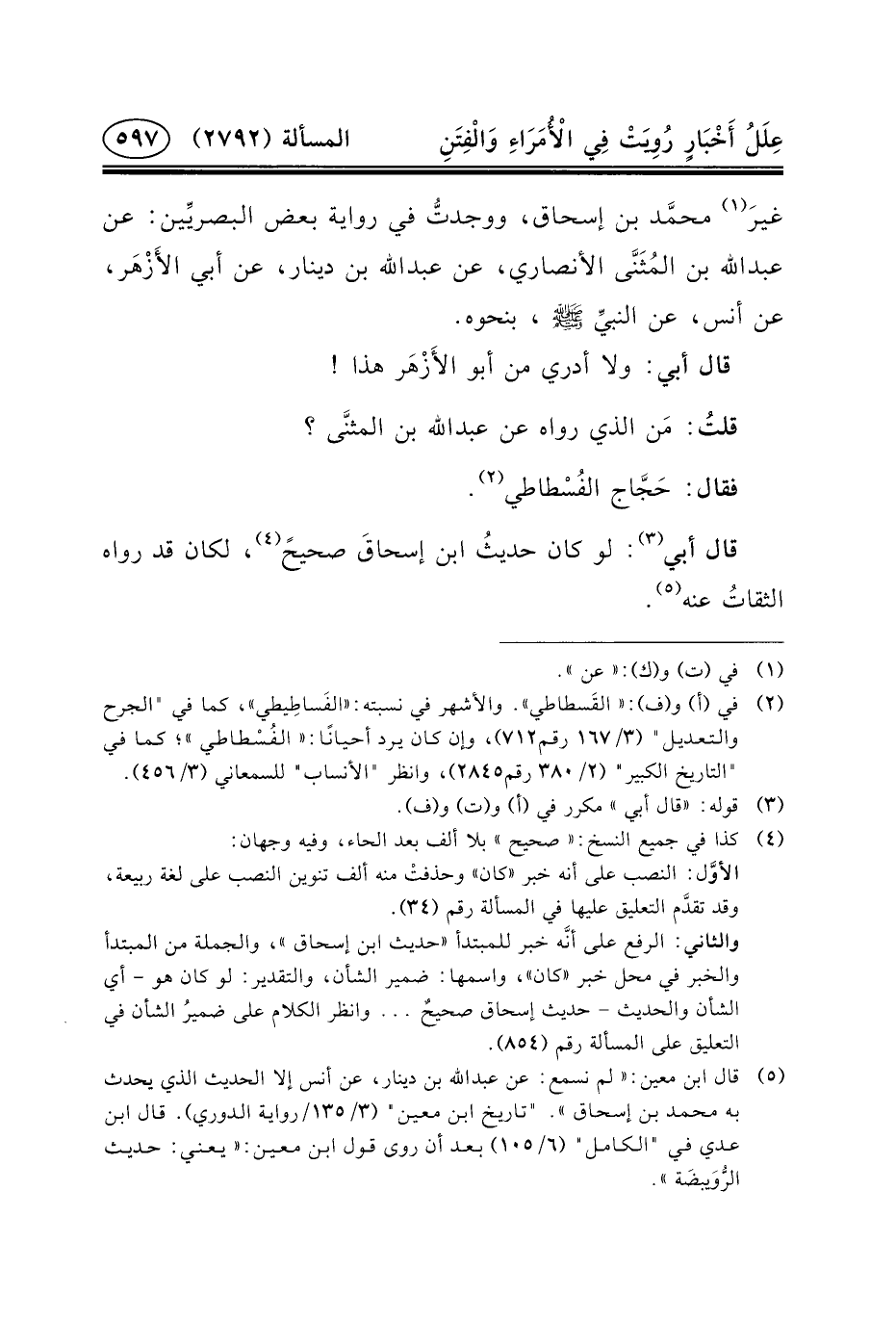 (٥) قال ابن معين: «لم نسمع: عن عبد الله بن دينار، عن أنس إلا الحديث الذي يحدث به محمد بن إسحاق» . "تاريخ ابن معين" (٣/١٣٥/رواية الدوري) . قال ابن عدي في "الكامل" (٦/١٠٥) بعد أن روى قول ابن معين: «يعني: حديث الرُّوَيبضَة» .