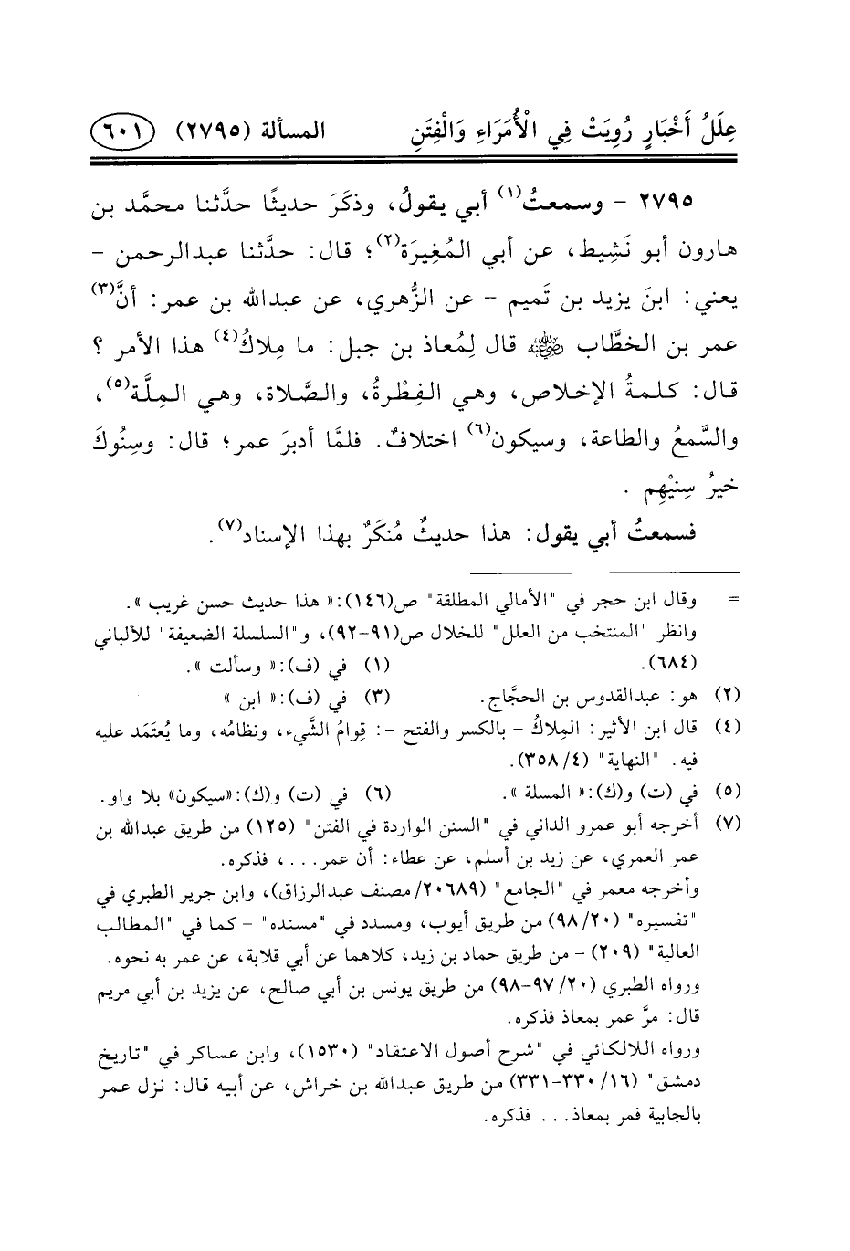 ٢٧٩٥ - وسمعتُ (١) أَبِي يقولُ، وذكَرَ حَدِيثًا حدَّثنا محمَّد بْنُ هَارُونَ أَبُو نَشِيط، عَنْ أَبِي المُغِيرَة (٢) ؛ قَالَ: حدَّثنا عبد الرحمن - يَعْنِي: ابنَ يَزِيدَ بْنِ تَميم - عن الزُّهري، عن عبد الله بْنِ عُمَرَ: أنَّ (٣) عُمَرَ بْنَ الخطَّاب ح قَالَ لِمُعاذ بْنِ جَبَلٍ: مَا مِلاكُ (٤) هَذَا الأَمْرِ؟ قَالَ: كلمةُ الإِخْلاصِ، وَهِيَ الفِطْرةُ، والصَّلاة، وَهِيَ المِلَّة (٥) ، والسَّمعُ وَالطَّاعَةُ، وَسَيَكُونُ (٦) اختلافٌ. فلمَّا أدبرَ عُمَرُ؛ قَالَ: وسِنُوكَ خيرُ سِنيْهِم.
