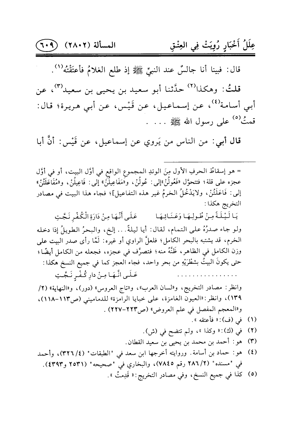 قلتُ: وَهَكَذَا (٢) حدَّثنا أَبُو سَعِيدِ بن يحيى ابن سَعِيدٍ (٣) ، عَنْ أَبِي أُسَامَةَ (٤) ، عَنْ إِسْمَاعِيلَ، عَنْ قَيْس، عَنْ أَبِي هُرَيْرَةَ؛ قَالَ: قمتُ (٥) عَلَى رَسُولِ الله (ص) ... .