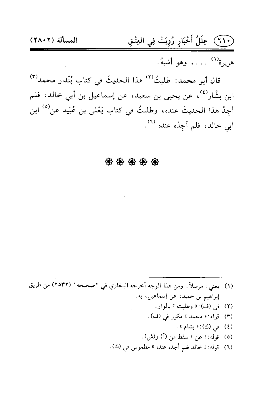 قَالَ أَبُو مُحَمَّدٍ: طلبتُ (٢) هَذَا الحديثَ فِي كِتَابِ بُنْدار مُحَمَّدِ (٣) بْنِ بشَّار (٤) ، عن يحيى ابن سَعِيدٍ، عَنْ إِسْمَاعِيلَ بْنِ أَبِي خَالِدٍ، فَلَمْ أجِدْ هَذَا الحديثَ عِنْدَهُ، وطلبتُ فِي كِتَابِ يَعْلى بْنِ عُبَيد عَنِ (٥) ابْنِ أَبِي خالد، فلم أجِدْه عنده (٦) .