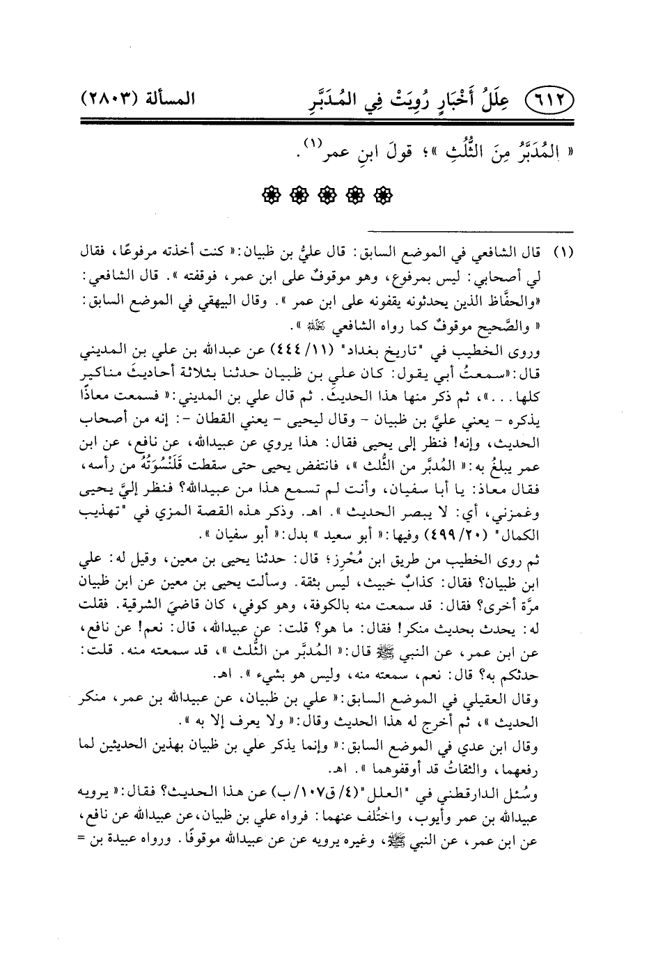 ثم روى الخطيب من طريق ابن مُحْرِز؛ قال: حدثنا يحيى بن معين، وقيل له: علي بن ظبيان؟ فقال: كذابٌ خبيث، ليس بثقة. وسألت يحيى بن معين عن ابن ظبيان مرَّة أخرى؟ فقال: قد سمعت منه بالكوفة، وهو كوفي، كان قاضيَ الشرقية. فقلت له: يحدث بحديث منكر! فقال: ما هو؟ قلت: عن عبيد الله، قال: نعم! عَنْ نَافِعٍ، عَنِ ابْنِ عُمَرَ، عن النبي (ص) قال: «المُدبَّر من الثُّلث» ، قد سمعته منه. قلت: حدثكم به؟ قال: نعم، سمعته منه، وليس هو بشيء» . اهـ.
