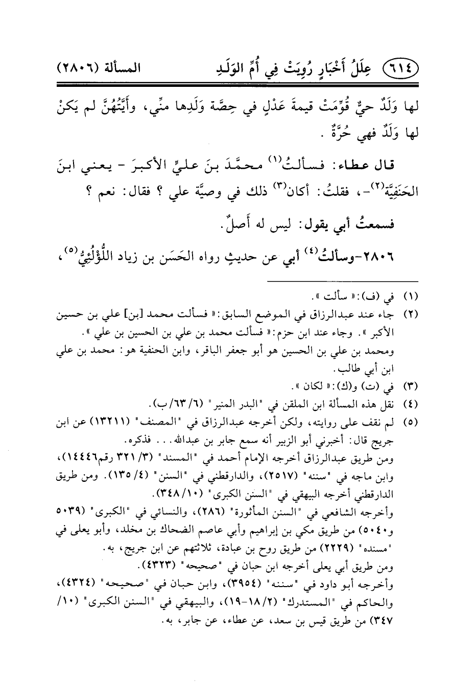 (٢) جاء عند عبد الرزاق في الموضع السابق: «فسألت مُحَمَّدِ [بْنِ] عَلِيِّ بْنِ حُسَيْنٍ الأكبر» . وجاء عند ابن حزم: «فسألت محمد بن علي بن الحسين بن علي» .