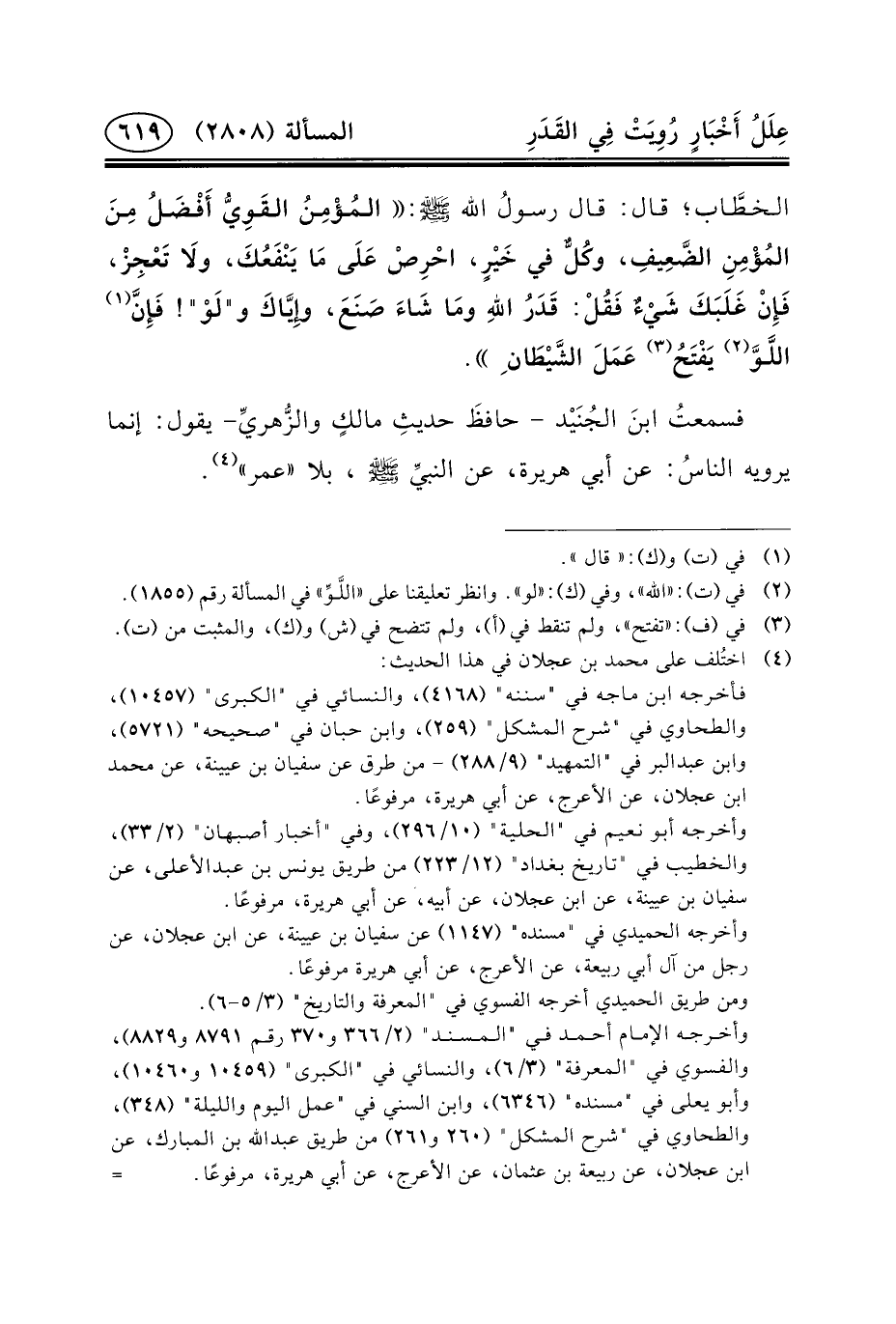 الخطَّاب؛ قَالَ: قَالَ رسولُ اللَّهِ (ص) : المُؤْمِنُ القَوِيُّ أَفْضَلُ مِنَ المُؤْمِنِ الضَّعِيفِ، وكُلٌّ فِي خَيْرٍ، احْرِصْ عَلَى مَا يَنْفَعُكَ، ولَا تَعْجِزْ، فَإِنْ غَلَبَكَ شَيْءٌ فَقُلْ: قَدَرُ اللهِ ومَا شَاءَ صَنَعَ، وإِيَّاكَ و"لَوْ"! فَإِنَّ (١) اللَّوَّ (٢) يَفْتَحُ (٣) عَمَلَ الشَّيْطَان ِ.
