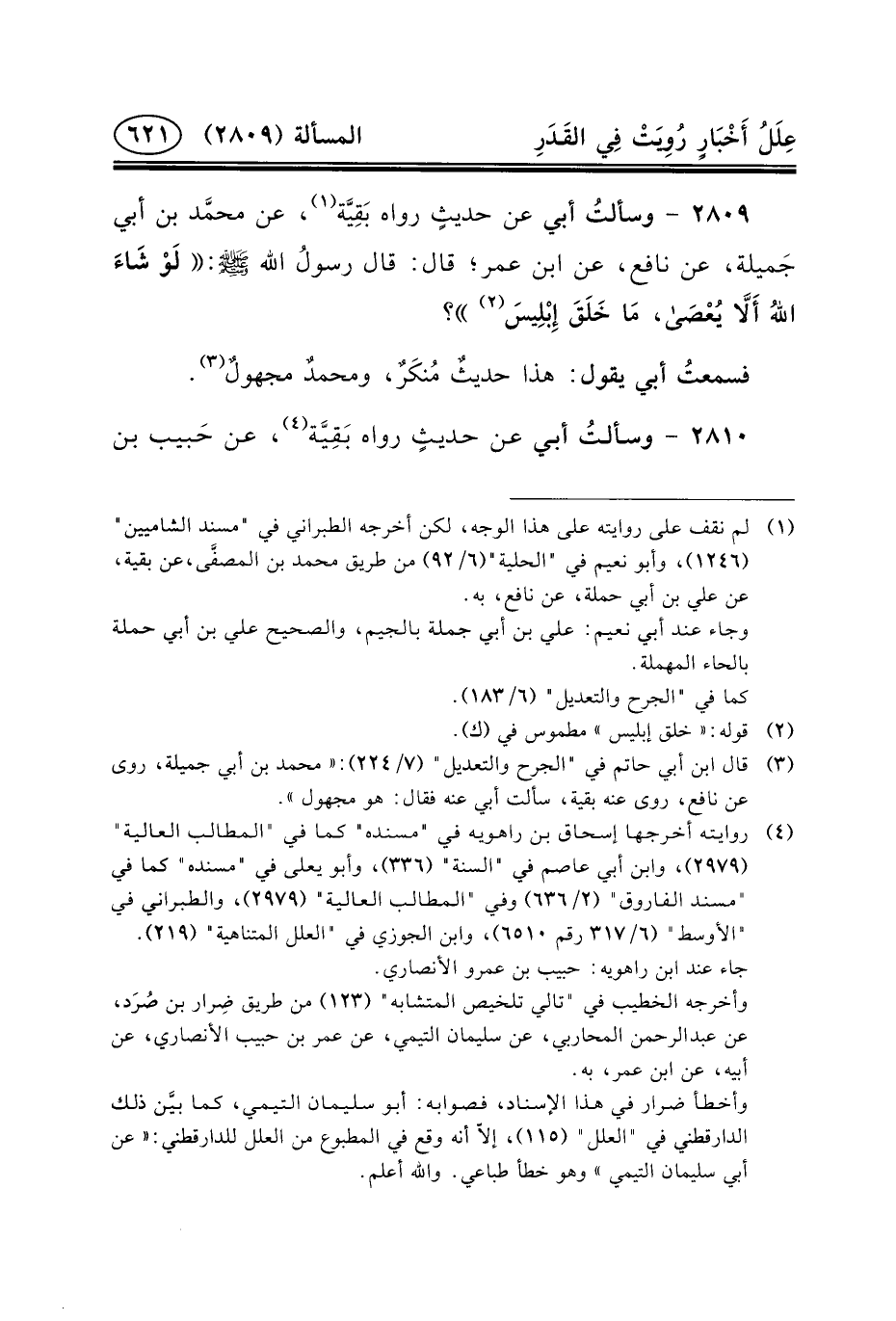٢٨٠٩ - وسألتُ أَبِي عَنْ حديثٍ رَوَاهُ بَقِيَّة (١) ، عَنْ محمَّد بْنِ أَبِي جَميلة، عَنْ نَافِعٍ، عَنِ ابْنِ عُمَرَ؛ قَالَ: قَالَ رسولُ اللَّهِ (ص) : لَوْ شَاءَ اللهُ أَلَاّ يُعْصَى، مَا خَلَقَ إِبْلِيسَ (٢) ؟