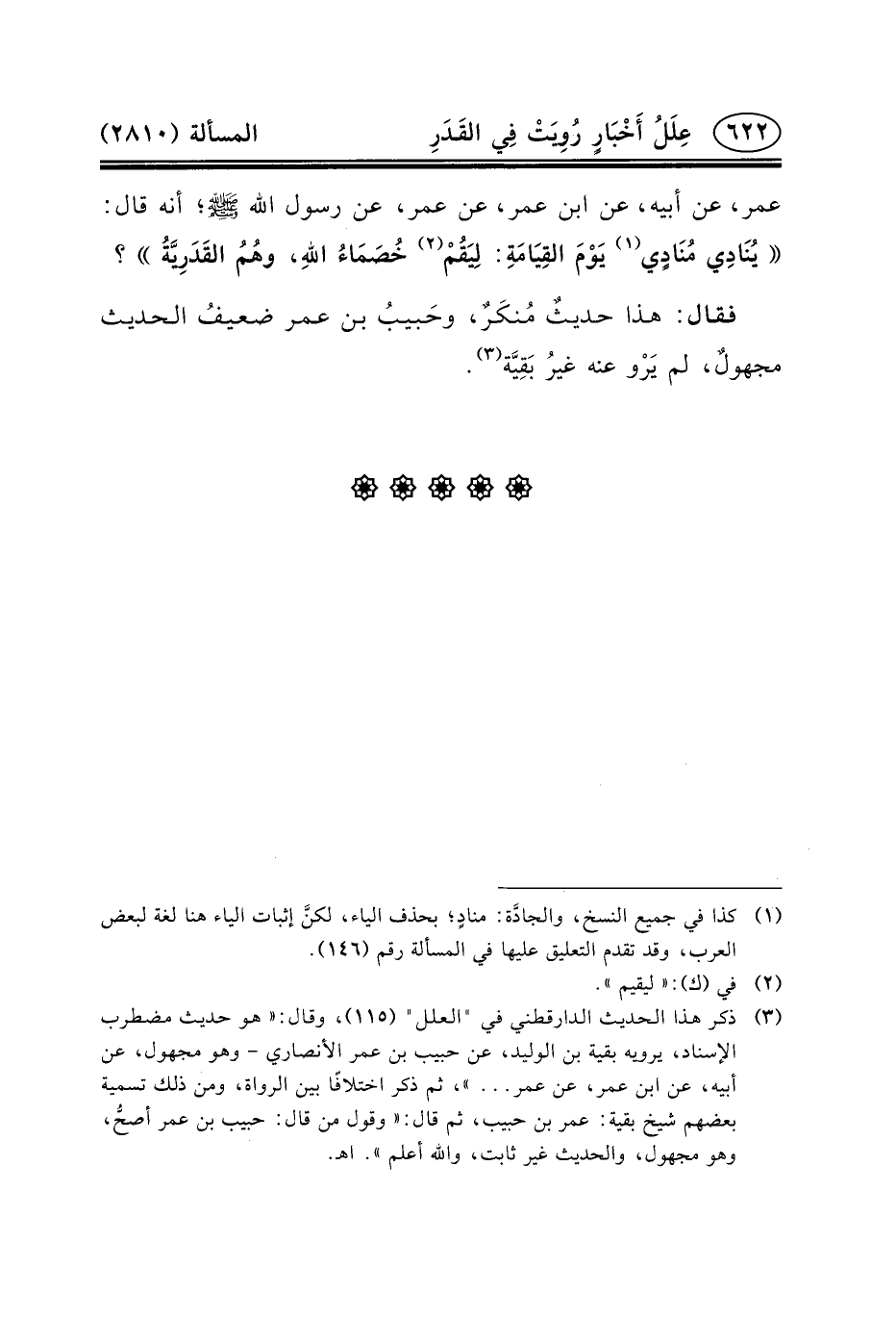عُمَرَ، عَنْ أَبِيهِ، عَنِ ابْنِ عُمَرَ، عَنْ عُمَرَ، عَنْ رَسُولِ الله (ص) ؛ أنه قال: يُنَادِي مُنَادٍي (١) يَوْمَ القِيَامَةِ: لِيَقُمْ (٢) خُصَمَاءُ اللهِ، وهُمُ القَدَرِيَّةُ؟