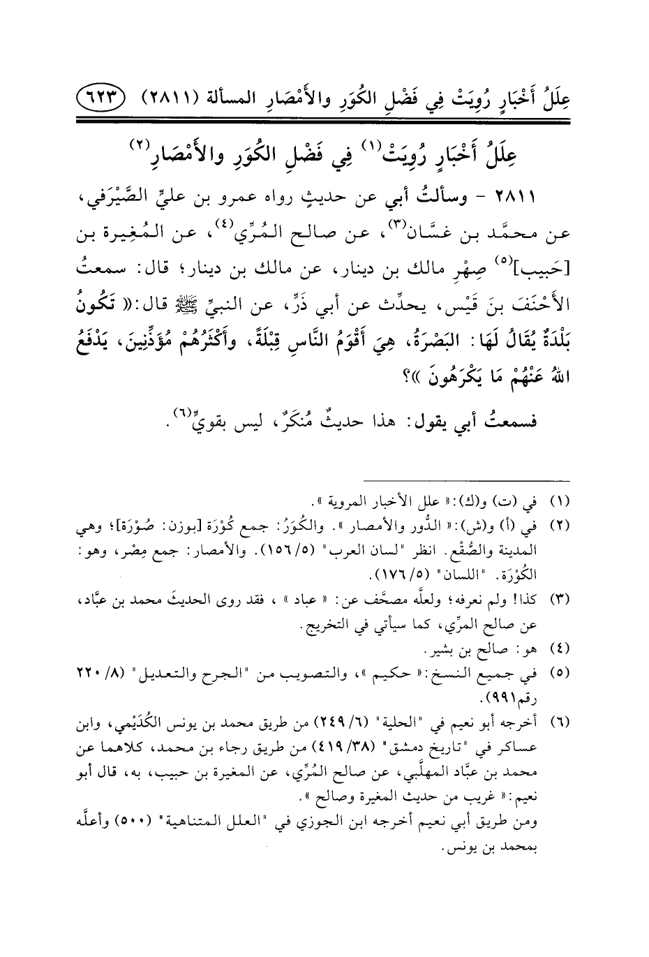 ٢٨١١ - وسألتُ أَبِي عَنْ حديثٍ رواه عمرو ابن عليٍّ الصَّيْرَفي، عَنْ محمَّد بْنِ غسَّان (٣) ، عَنْ صَالِحٍ المُرِّي (٤) ، عَنِ المُغِيرة بن [حَبيب] (٥) صِهْرِ مَالِكٍ بْنِ دِينَارٍ، عَنْ مَالِكِ بْنِ دِينَارٍ؛ قَالَ: سمعتُ الأَحْنَفَ بنَ قَيْس، يحدِّث عَنْ أبي ذَرٍّ، عن النبيِّ (ص) قَالَ: تَكُونُ بَلْدَةٌ يُقَالُ لَهَا: البَصْرَةُ، هِيَ أَقْوَمُ النَّاسِ قِبْلَةً، وأَكْثَرُهُمْ مُؤَذِّنِينَ، يَدْفَعُ اللهُ عَنْهُمْ مَا يَكْرَهُونَ؟