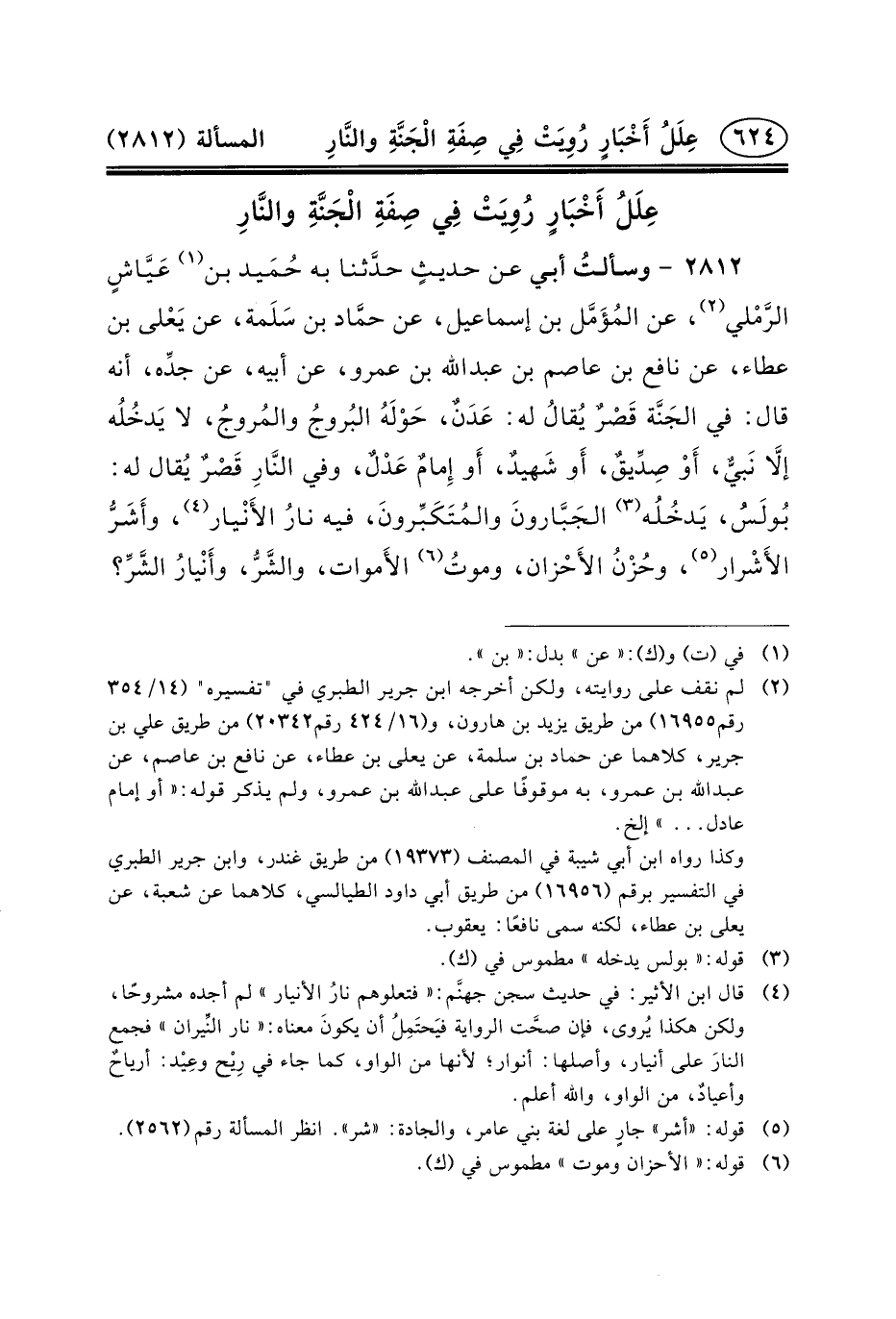 عَنِ المُؤَمَّل بْنِ إِسْمَاعِيلَ، عَنْ حمَّاد بْنِ سَلَمة، عَنْ يَعْلى بْنِ عَطَاءٍ، عَنْ نافع بن عاصم بن عبد الله بْنِ عَمْرٍو، عَنْ أَبِيهِ، عَنِ جدِّه، أَنَّهُ قَالَ: فِي الجَنَّة قَصْرٌ يُقالُ لَهُ: عَدَنٌ، حَوْلَهُ البُروجُ والمُروجُ، لا يَدخُلُه إلَاّ نَبيٌّ، أَوْ صِدِّيقٌ، أَو شَهيدٌ، أَو إِمامٌ عَدْلٌ، وَفِي النَّارِ قَصْرٌ يُقال لَهُ: بُولَسُ، يَدخُلُه (٣) الجَبَّارونَ والمُتَكَبِّرونَ، فِيهِ نارُ الأَنْيار (٤) ، وأَشَرُّ الأَشْرار (٥) ، وحُزْنُ الأَحْزان، وموتُ (٦) الأَموات، والشَّرُّ، وأَنْيارُ الشَّرِّ؟