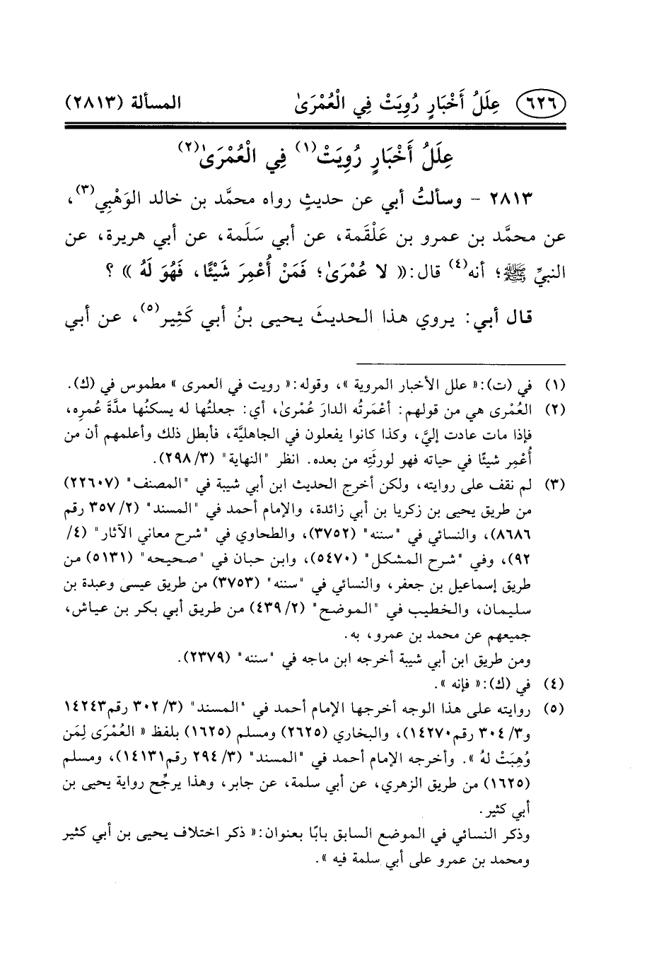 ٢٨١٣ - وسألتُ أَبِي عَنْ حديثٍ رَوَاهُ محمَّد بْنُ خَالِدٍ الوَهْبِي (٣) ، عَنِ محمَّد بْن عَمْرِو بْنِ عَلْقَمة، عَنْ أَبِي سَلَمة، عَنْ أَبِي هريرة، عن النبيِّ (ص) ؛ أَنَّهُ (٤) قَالَ: لا عُمْرَى؛ فَمَنْ أُعْمِرَ شَيْئًا، فَهُوَ لَهُ؟