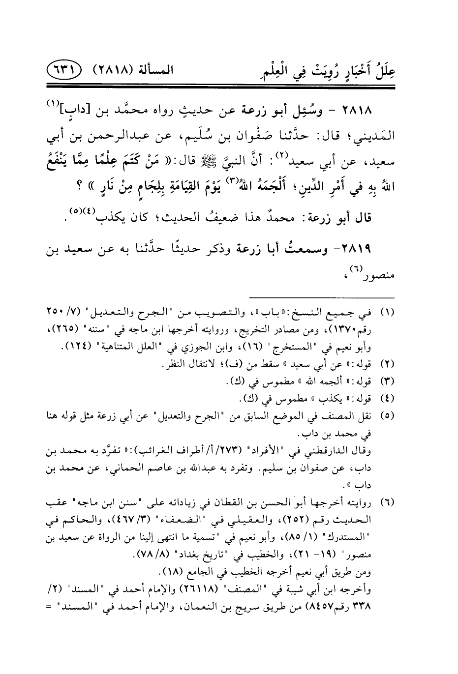 ٢٨١٨ - وسُئِل أَبُو زُرْعَةَ عَنْ حديثٍ رَوَاهُ محمَّد بْنُ [دابٍ] (١) المَديني؛ قَالَ: حدَّثنا صَفْوان بْنُ سُلَيم، عن عبد الرحمن بْنِ أَبِي سَعِيدٍ، عَنْ أَبِي سعيد (٢) : أنَّ النبيَّ (ص) قَالَ: مَنْ كَتَمَ عِلْمًا مِمَّا يَنْفَعُ اللهُ بِهِ فِي أَمْرِ الدِّينِ؛ أَلْجَمَهُ اللهُ (٣) يَوْمَ القِيَامَةِ بِلِجَامٍ مِنْ نَارٍ؟