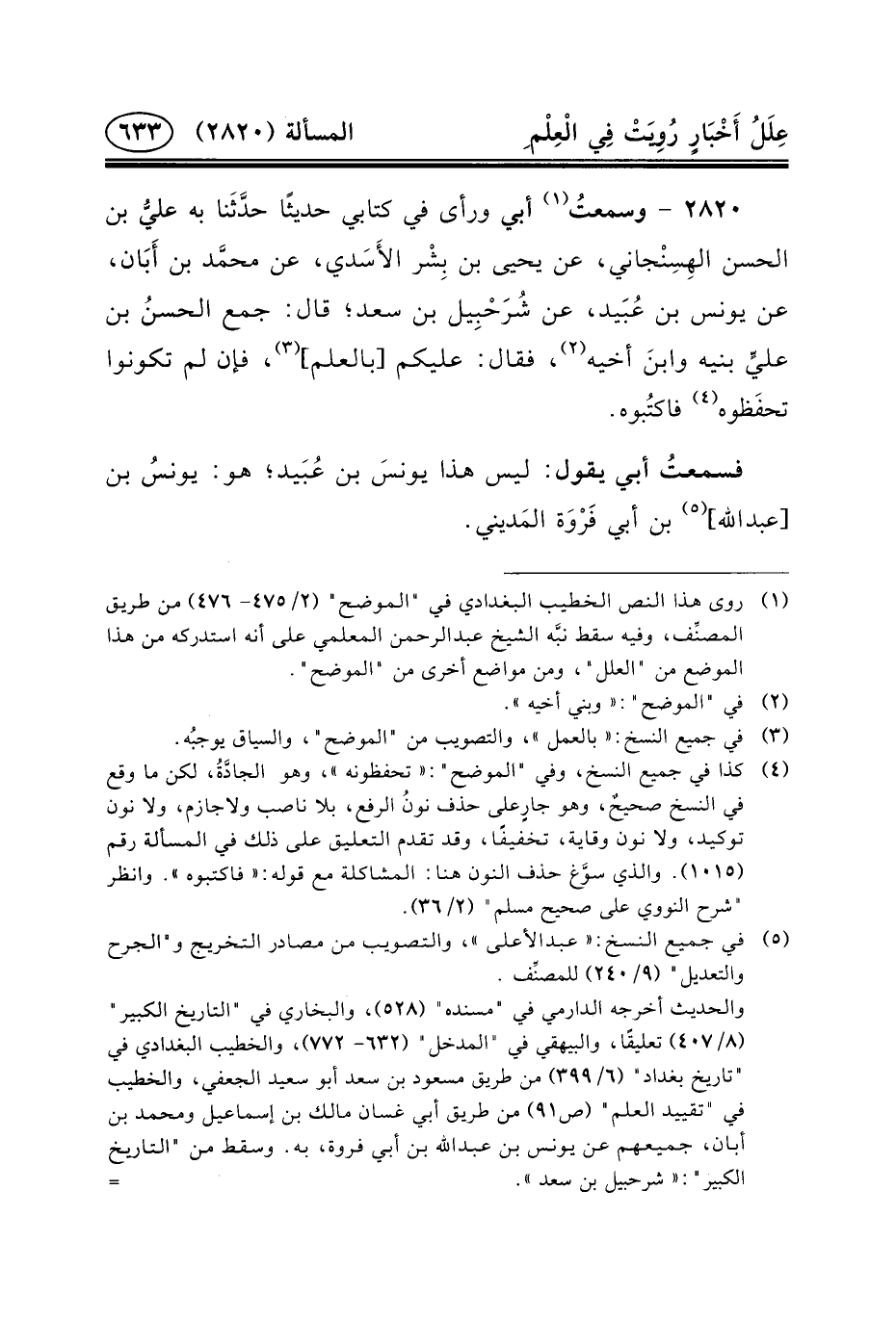 ٢٨٢٠ - وسمعتُ (١) أَبِي وَرَأَى فِي كِتَابِي حَدِيثًا حدَّثَنا بِهِ عليُّ بْنُ الحسن الهِسِنْجاني، عَنْ يَحْيَى بْنِ بِشْر الأَسَدي، عَنْ محمَّد بْنِ أَبَان، عَنْ يُونُسَ بْنِ عُبَيد، عَنْ شُرَحْبِيل بْنِ سَعْدٍ؛ قَالَ: جَمَعَ الحسنُ بْنُ عليٍّ بَنِيهِ وابنَ أَخِيهِ (٢) ، فَقَالَ: عَلَيْكُمْ [بِالْعِلْمِ] (٣) ، فَإِنْ لَمْ تَكُونُوا تحفَظوه (٤) فاكتُبوه.
