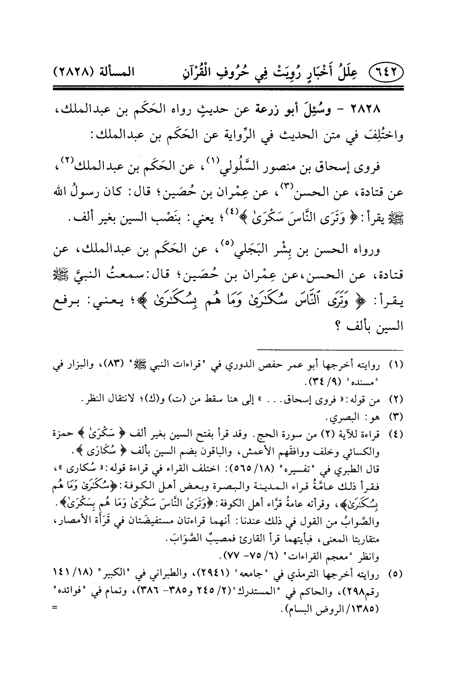 فروى إسحاق بن منصور السَّلُولي (١) ، عن الحَكَم بن عبد الملك (٢) ، عَنْ قَتَادَةَ، عَنِ الحَسَنِ (٣) ، عَنْ عِمْران بْنِ حُصَين؛ قَالَ: كَانَ رسولُ الله (ص) يَقْرَأُ: {وَتَرَى النَّاسَ سَكْرَى} (٤) ؛ يَعْنِي: بنَصْب السِّينِ بِغَيْرِ أَلِفٍ.
