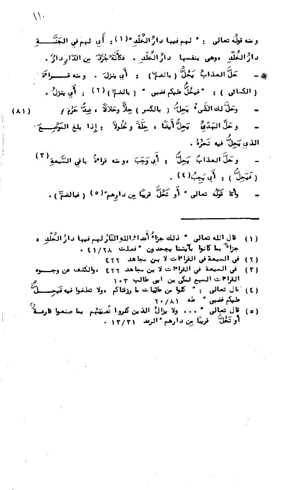 حَلَّ العَذَابُ يَحُلُّ بِالضَّمِ، أَيْ: يَنْزِلُ، وَمِنْهُ قِرَاءَةُ الكَسَائِيّ {فَيَحُلَّ عَلَيْكُمْ غَضَبِي} [طه: 81] بِالضَّمِ أَيْ: يَنْزِلُ. وحَلَّ لك الشّيْءُ يحِلُّ بالكسر حِلاًّ وحَلاَلاً ضد حَرُم. وَحَلَّ الهَدْيُ: يَحِلُّ أَيْضاً حِلَّةً وَحُلُولاً: إِذَا بَلَغَ المَوْضِعَ الَّذِي يَحِلُّ فِيهِ نَحْرُهُ. وَحَلَّ العَذَابُ يَحِلُّ، أَيْ: وَجَبَ، وَمِنْهُ قِرَاءَةُ بَاقِي السَّبْعَةِ: (فَيَحِلُّ). أَيْ: يَجِبُ. وَأَمَّا قَوْلُهُ تَعَالَى: {أَوْ تَحُلُّ قَرِيبًا مِنْ دَارِهِمْ} [الرعد: 31] فَبِالضَّمِ.