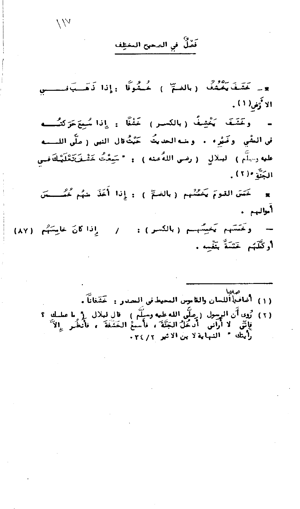 خَشَفَ يَخْشُفُ بِالضَّم خُشُوفاً: إِذَا ذَهَبَ فِي الأَرْضِ. وَخَشَفَ يَخْشِفُ بِالكَسْرِ خَشْفاً: إِذَا سُمِعَ حَرَكَتُهُ فِي المَشْيِ وَغَيْرِهِ، وَمِنْهُ الحَدِيثُ، حَيْثُ قَالَ - صلى الله عليه وسلم - لِبِلاَلٍ رَضِيَ اللَّهُ عَنْهُ: "سَمِعْتُ خَشْفَ نَعْلَيْكَ فِي الجَنَّةِ".