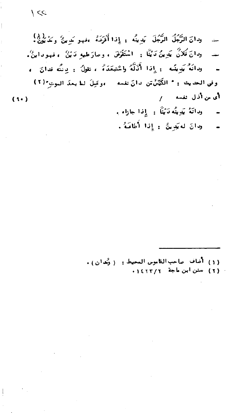 وَدَانَ الرَّجُلُ الرَّجُلَ يَدِينُهُ: إِذَا أَقْرَضَهُ، فَهُوَ مَدِينٌ وَمَدْيُونٌ. وَدَانَ فُلاَنٌ يَدِينُ دَيْناً: اسْتَقْرَضَ وَصَارَ عَلَيْهِ دَيْنٌ، فَهُوَ دَائِنٌ. وَدَانَهُ يَدِينُهُ: إِذَا أَذَلَّهُ وَاسْتَعْبَدَهُ، تَقُولُ: دِنْتُهُ فَدَانَ. وَفِي الحَدِيثِ: "الكَيِّسُ مَنْ دَانَ نَفْسَهُ وَعَمِلَ لِمَا بَعْدَ المَوْتِ"، أَيْ: مَنْ أَذَلَّ نَفْسَهُ، وَدَانَهُ يَدِينُهُ دِيناً أَيْ: جَازَاهُ. وَدَانَ لَهُ يَدِينُ: إِذَا أَطَاعَهُ.