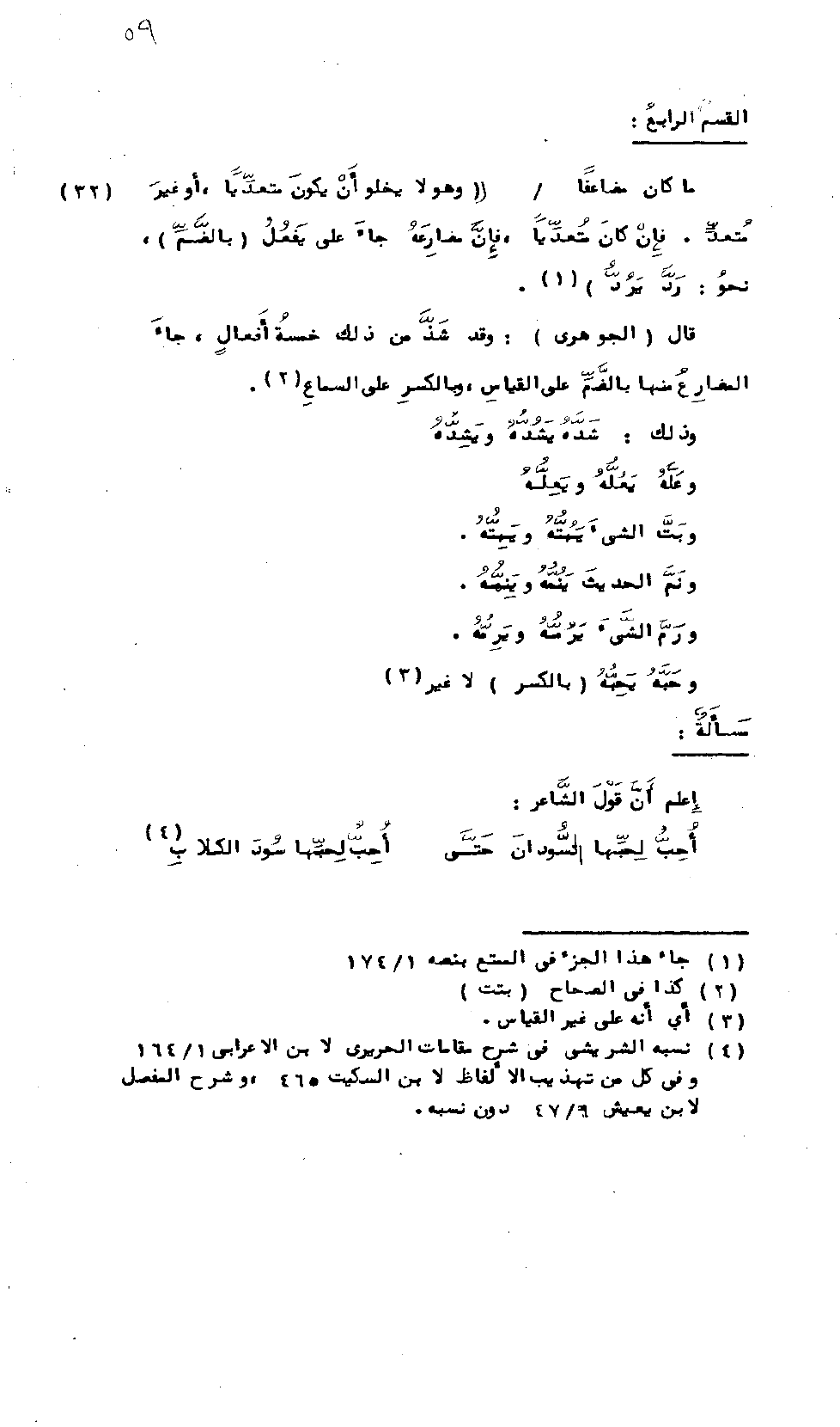 قَالَ الجَوْهَرِيُّ: وَقَدْ شَذَّ مِنْ ذَلِكَ خَمْسَةُ أَفْعَالٍ جَاءَ المُضَارِعُ مِنْهَا بِالضَّمّ عَلَى القِيَاسِ، وَبالكَسْرِ عَلَى السَّمَاعِ، وَذَلِك نَحْوُ: شَدَّهُ يَشُدُّهُ وَيَشِدُّهُ، وَعَلَّهُ ويَعُلُّهُ وَيَعِلُّهُ، وَبَتَّ الشَّيْءَ يَبُتُّه وَيَبِتُّهُ، وَنَمَّ الحَدِيثَ يَنُمُّهُ وَيَنِمُّهُ وَرَمَّ الشَّيْءَ يَرُمُّهُ وَيَرِمُّهُ، وَحَبَّهُ يَحِبُّهُ بالكَسْرِ لاَ غَيْرُ.