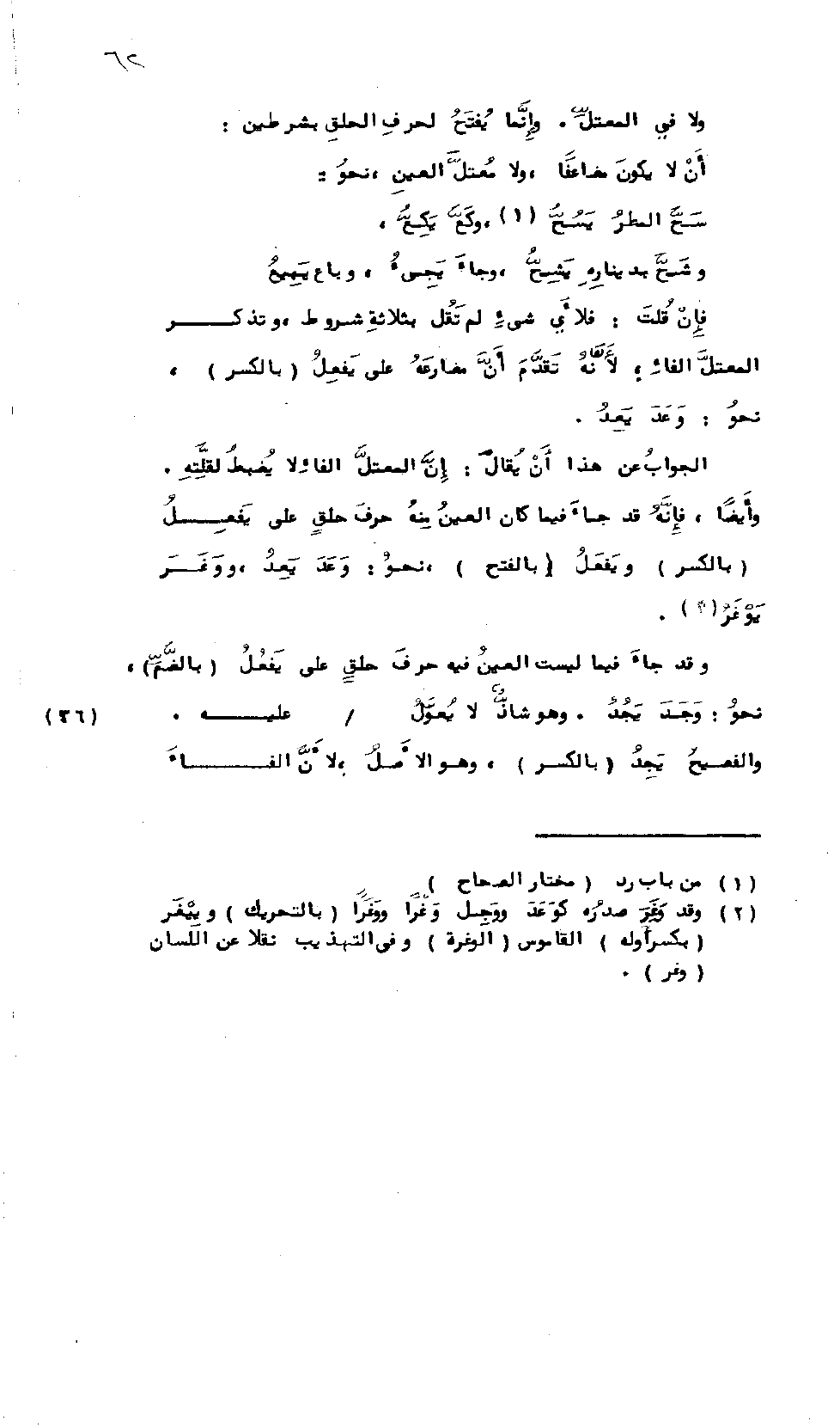 أَنْ لاَ يَكُونَ مُضَاعَفاً وَلاَ مُعْتَلَّ العَيْن نَحْوُ: سَحَّ المَطَرُ يَسُحُّ، وَكَعَّ يَكِعُّ، وَشَحَّ بِدِينَارِهِ يَشُحُّ، وَجَاءَ يَجِيءُ، وَبَاعَ يَبِيعُ.