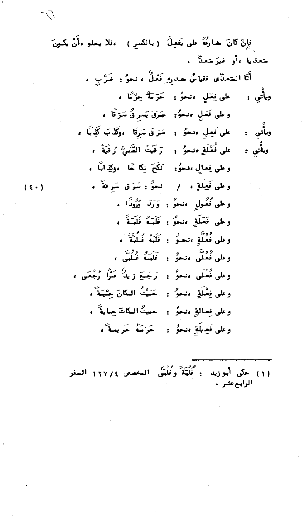 أَمَّا المُتَعَدّي، فَقِيَاسُ مَصْدَرِهِ: (فَعْلٌ) نَحْوُ: ضَرْبٍ، وَيَأْتِي عَلَى فِعْلِ، نَحْوُ: حَرَمَهُ حِرْماً، وَعَلَى فَعَلِ نَحْوُ: سَرَقَ يَسْرِقُ سَرَقاً، وَيَأْتِي عَلَى فَعِلٍ نَحْوُ: سَرَقَ سَرِقاً، وَكَذَبَ كَذِباً، وَيَأْتِي عَلَى فُعْلَةٍ نَحْوُ: رَقَيْتُ الصَّبِيَّ رُقْيَةً، وَعَلَى فِعَالٍ نَحْوُ: نَكَحَ نِكَاحاً، وَ [كَذَبَ] كِذَاباً، وَعَلَى فَعِلَةٍ نَحْوُ: سَرَقَ سَرِقَةً، وَعَلَى فُعُولٍ نَحْوُ: وَرَدَ وُرُوداً، وَعَلَى فَعَلَةٍ نَحْوُ: غَلَبَهُ غَلَبَةً، وَعَلَى فُعُلَّةِ نَحْوُ: غَلَبَهُ غُلُبَّةً، وَعَلَى فُعُلَّى نحو: غَلَبَهُ غُلُبَّى، وَعَلَى فُعْلَى نَحْو: رَجَعَ زَيْدٌ عَمْراً رُجْعَى، وَعَلَى فِعْلَةٍ نَحْوُ: حَمَيْتُ المَكَانَ حِمْيَةً، وَعَلَى فِعَالَةٍ نَحْوُ: حَمَيْتُ المَكَانَ حِمَايَةً، وَعَلَى فَعِيلَةٍ نَحْوُ: حَرَمَهُ حَرِيمَةً،