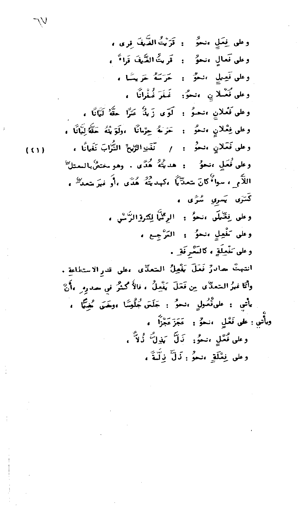 وَعَلَى فِعَلٍ، نَحْوُ: قَرَيْتُ الضَّيْفَ قِرَىً وَعَلَى فَعَالٍ نَحْوُ: قَرَيْتُ الضَّيْفَ قَرَاءً، وَعَلَى فَعِيلِ نَحْوُ: حَرَمَهُ حَرِيماً، وَعَلَى فُعْلاَنٍ نَحْوُ: غَفَرَ غُفْرَاناً، وَعَلَى فَعْلاَنٍ نَحْوُ: لَوَى زَيْدٌ عَمْراً حَقَّهُ لَيَّانَا، وَعَلَى فِعْلاَنٍ نَحْوُ: حَرَمَهُ حِرْمَاناً، وَلَوَيْتُهُ حَقَّهُ لِيَّاناً، وَعَلَى فَعَلاَنٍ نَحْوُ: نَفَتِ الرّيحُ التّرَابَ نَفَيَاناً، وَعَلَى فُعَلٍ نَحْوُ: هَدَيْتُهُ هُدًى، وَهُوَ مُخْتَصٌّ بِالمُعْتَلِ اللاَّمِ، سَوَاءٌ كَانَ مُتَعَدِّياً كَهَدَيْتُهُ هُدًى، أَوْ غَيْرَ مُتَعَدٍّ كَسَرَى يَسْرِي سُرىً، وَعَلَى فِعِّيلَى نَحْوُ: الرّمِّيَا لِكَثْرَةِ الرَّمْيِ، وَعَلَى مَفْعِلٍ نَحْوُ: المَرْجِع، وَعَلَى مَفْعِلَةٍ كَالمَعْرِفَةِ.