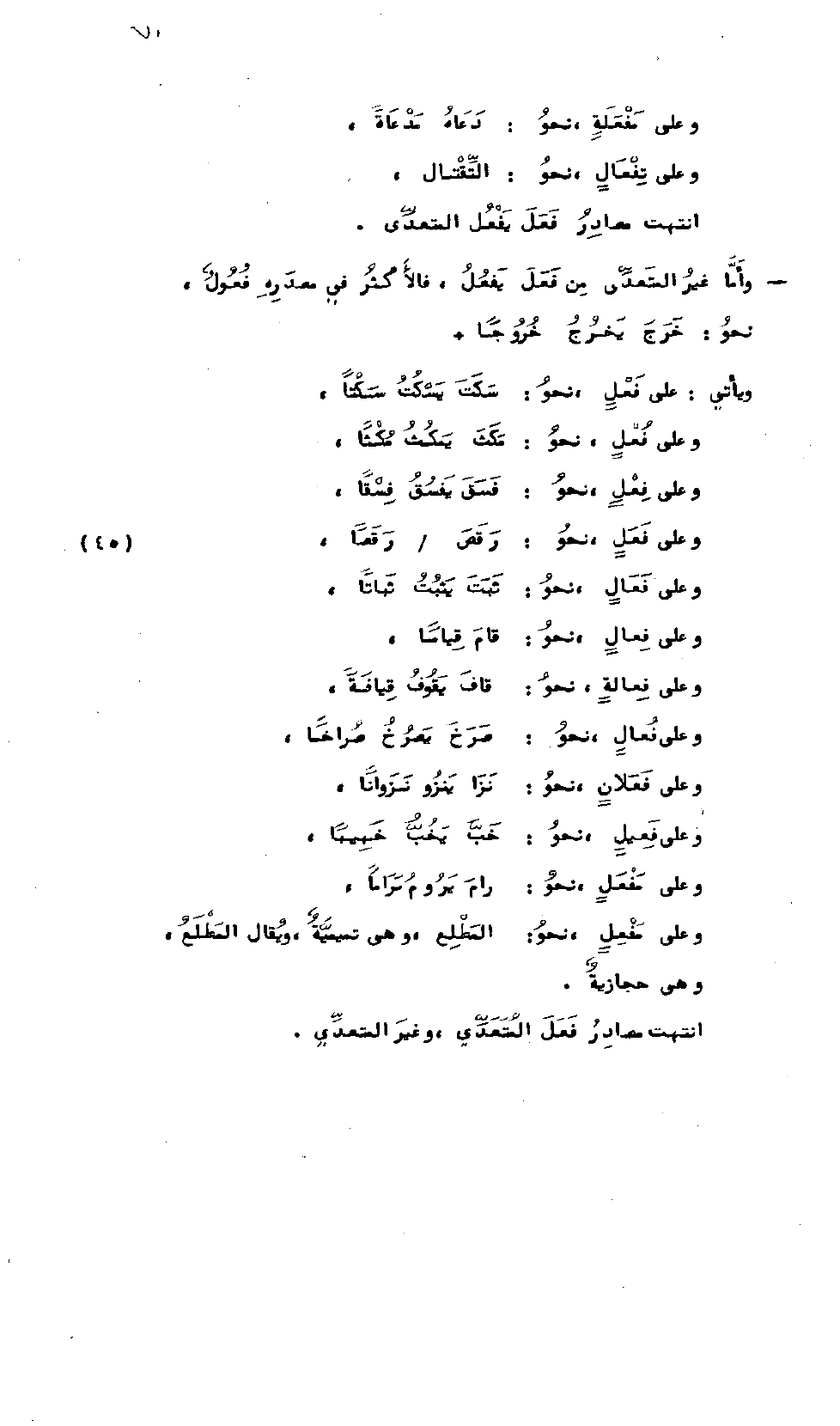 وَأَمَّا غَيْرُ المُتَعَدِي مِنْ (فَعَلَ يَفْعُلُ)، فَالأَكْثَرُ فِي مَصْدَرِهِ: (فُعُولٌ) نَحْوُ: خَرَجَ يَخْرُجُ خُرُوجاً، وَيَأْتِي عَلَى فَعْلٍ نَحْوُ: سَكَتَ يَسْكُتُ سَكْتاً، وَعَلَى فُعْلٍ نَحْوُ: مَكَثَ يَمْكُثُ مُكْثاً، وَعَلَى فِعْلٍ نَحْوُ: فَسَقَ يَفْسُقُ فِسْقاً، وَعَلَى فَعَلٍ نَحْوُ: رَقَصَ رَقَصاً، وَعَلَى فَعَالٍ نَحْوُ: ثَبَتَ يَثْبُتُ ثَبَاتاً، وَعَلَى فِعَالٍ نَحْوُ: قَامَ قِيَاماً، وَعَلَى فِعَالَةٍ نَحْوُ: قَافَ يَقُوفُ قِيَافَةً، وَعَلَى فُعَالٍ نَحْوُ: صَرَخَ يَصْرُخُ صُرَاخاً، وَعَلَى فَعَلاَنٍ نَحْوُ: نَزَا يَنْزُو نَزَواناً، وَعَلَى فَعِيلٍ نَحْوُ: خَبَّ يَخُبُّ خَبِيباً، وَعَلَى مَفْعَلٍ نَحْوُ: رَامَ يَرُومُ مَرَاماً، وَعَلَى مَفْعِلٍ نَحْوُ: المَطْلِع، وَهِيَ تَمِيمَيَّةٌ، وَيُقَالُ: المَطْلَعُ وَهِيَ حِجَازِيَّةٌ.