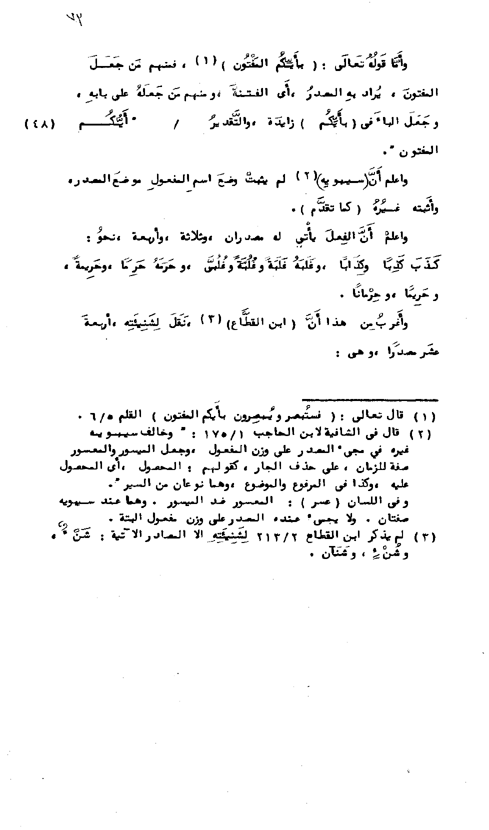 وَأَمَّا قَوْلُهُ تَعَالَى: {بِأَيِّكُمُ الْمَفْتُونُ} [القلم: 6] فَمِنْهُمْ مَنْ جَعَلَ المَفْتُونَ يُرَادُ بِهِ: المَصْدَرُ، أَيْ: الفِتْنَةُ، وَمِنْهُمْ مَنْ جَعَلَهُ عَلَى بَابِهِ، وَجَعَلَ البَاءَ فِي: (بِأَيِِّكُمْ) زَائِدَةً، وَالتَقْدِيرُ: أَيُّكُمُ المَفْتُونُ.