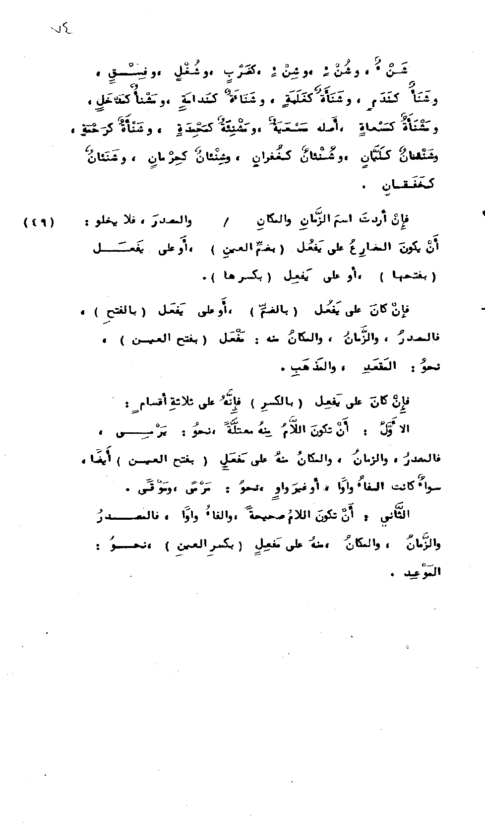 فَإِنْ أَرَدْتَ اسْمَ الزَّمَانِ والمَكَانِ والمَصْدَرِ، فَلاَ يَخْلُو أَنْ يَكُونَ المُضَارِعُ عَلَى (يَفْعُلُ) بِضَمِ العَيْنِ، أَوْ عَلَى (يَفْعَلُ) بِفَتْحِهَا أَوْ عَلَى (يَفْعِلُ) بِكَسْرِهَا، فَإِنْ كَانَ عَلَى (يَفْعُلُ) بِالضَّم أَوْ عَلَى (يَفْعَلُ) بالفَتْحِ، فَالمَصْدَرُ وَالزَّمَانُ وَالمَكَانُ مِنْهُ: (مَفْعَلٌ) بِفَتَحْ العَيْنِ نَحْوُ: المَقْعَد والمَذْهَب، فَإِنْ كَانَ عَلَى (يَفْعِلُ) بِالكَسْرِ، فَإِنَّهُ عَلَى ثَلاَثَةِ أَقْسَامٍ:
