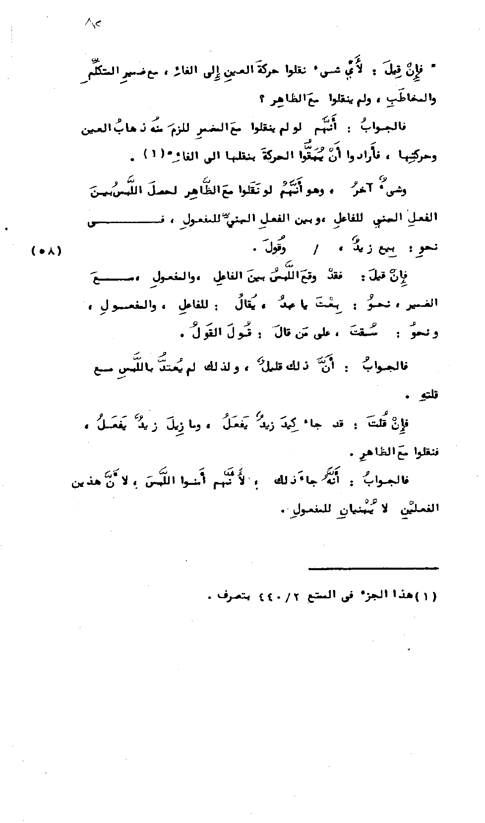 فَالجَوَابُ: أَنَّهُمْ لَوْ لَمْ يَنْقُلُوا مَعَ المُضْمَرِ لَلَزِمَ مِنْهُ ذَهَابُ العَيْن وَحَرَكَتِهَا، فَأَرَادُوا أَنْ يُبْقُوا الحَرَكَةَ بِنَقْلِهَا إِلَى الفَاءِ، وَشَيْءٌ آخَرُ: وَهُوَ أَنَّهُمْ لَوْ نَقَلُوا مَعَ الظَّاهِرِ لَحَصَلَ اللَّبْسُ بَيْنَ الفِعْلِ المَبْنِيّ لِلْفَاعِلِ وَبَيْنَ الفِعْلِ المَبْنِي لِلْمَفْعُولِ فِي نَحْوِ بِيعَ زَيْدٌ، وَقُولَ [القَوْلُ].