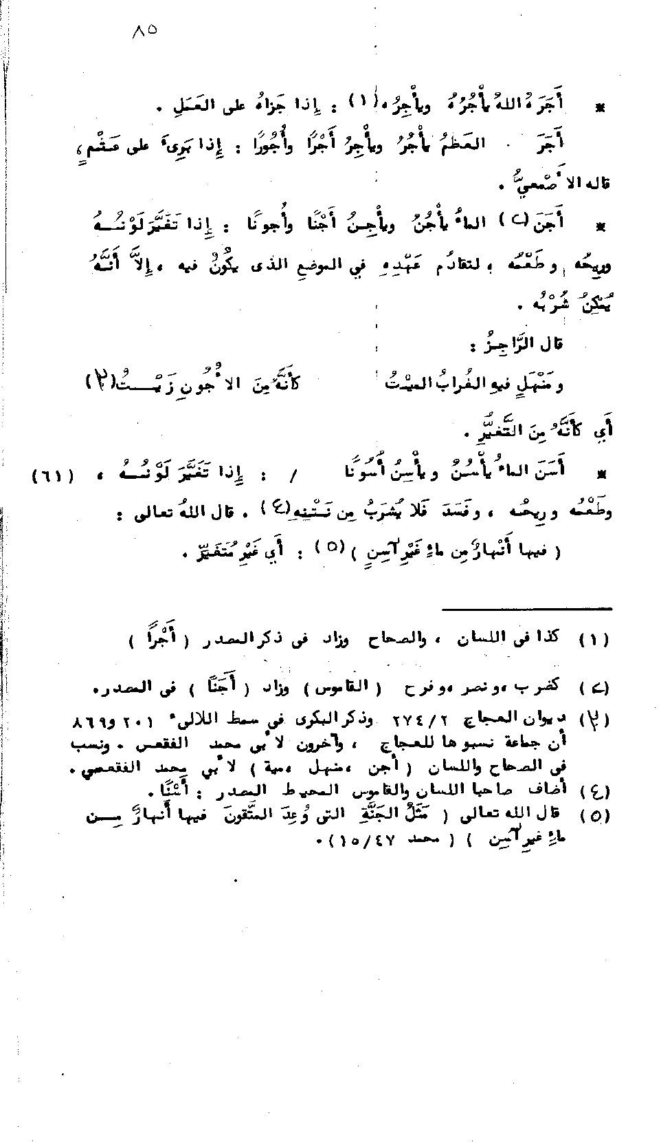 أَجَنَ المَاءُ يَأْجُنُ وَيَأْجِنُ أَجْناً وَأُجُوناً: إِذَا تَغَيَّرَ لَوْنُهُ وَرِيحُهُ وَطَعْمُهُ لِتَقَادُمِ عَهْدِهِ فِي المَوْضِعِ الَّذِي يَكُونُ فِيه، إِلاَّ أَنَّهُ يُمْكِنُ شُرْبُهُ، قَالَ الرَّاجِزُ [العجاج]: