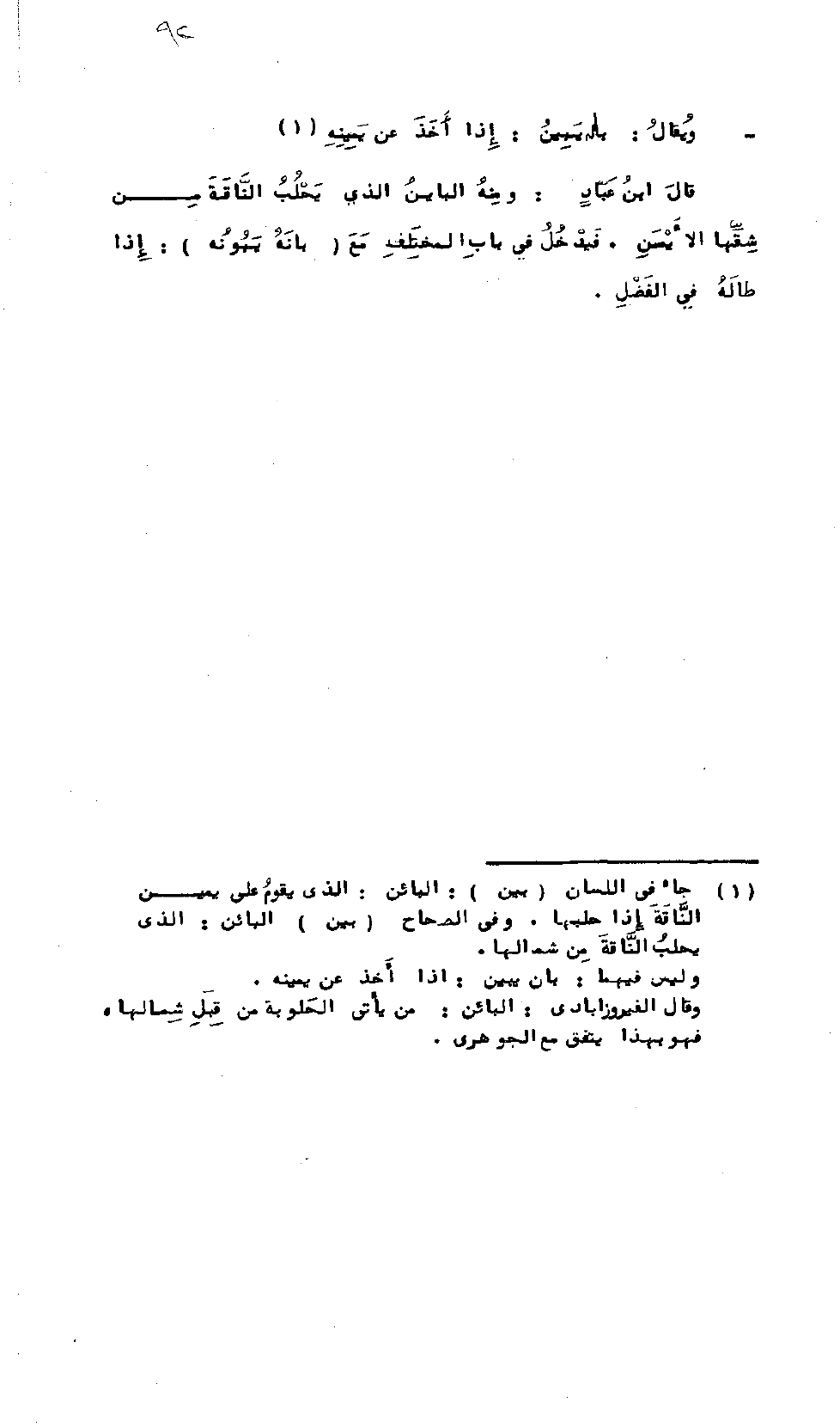 وَيُقَالُ: بَانَ يَبِينُ: إِذَا أَخَذَ عَنْ يَمِينِهِ، قَالَ ابْنُ عَبَّاد: وَمِنْهُ: البَائِنُ الذِي يَحْلُبُ النَّاقَةَ مِنْ شِقِّهَا الأَيْمَنِ، فَيَدْخُلُ فِي بَابِ المُخْتَلِفِ مَعَ (بَانَهُ يَبُونُهُ): إِذَا طَالَهُ فِي الفَضْلِ.