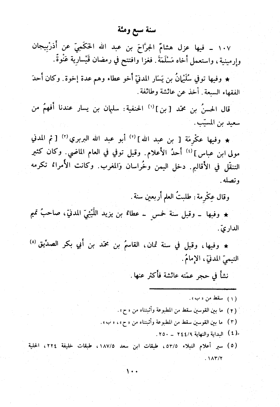 وفيها توفي سلَيمان بن يسار المدني أخو عطاء وهم عدة إخوة. وكان أحدَ الفقهاء السبعة. أخد عن عائشة وطائفة.