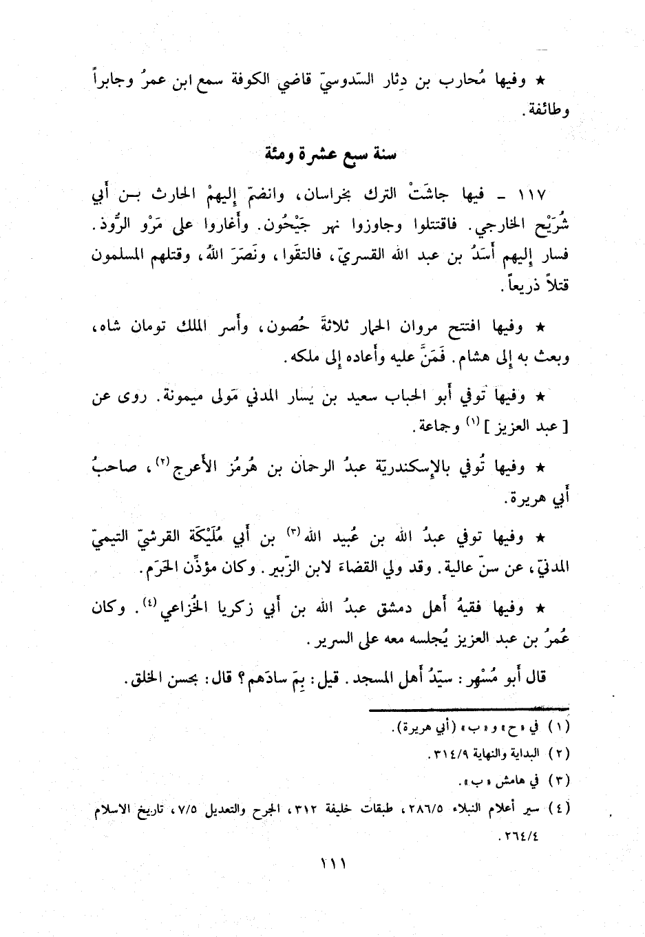 وفيها توِفي أبو الحباب سعيد بن يسار المدني مولى ميمونة. روى عن عبد العزيز وجماعة. وفيها توِفي بالإسكندريّة عبد الرحمن بن هُرمز الأعرج، صاحبُ أبي هريرة.