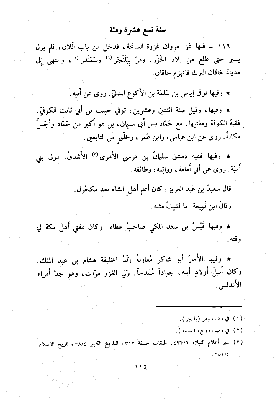 وفيها فقيه دمشق سليمان بن موسى الأموي الأشدقُ. مولى بني أمية. روى عن أْبي أمامة، ووَاثلة، وطائفة.