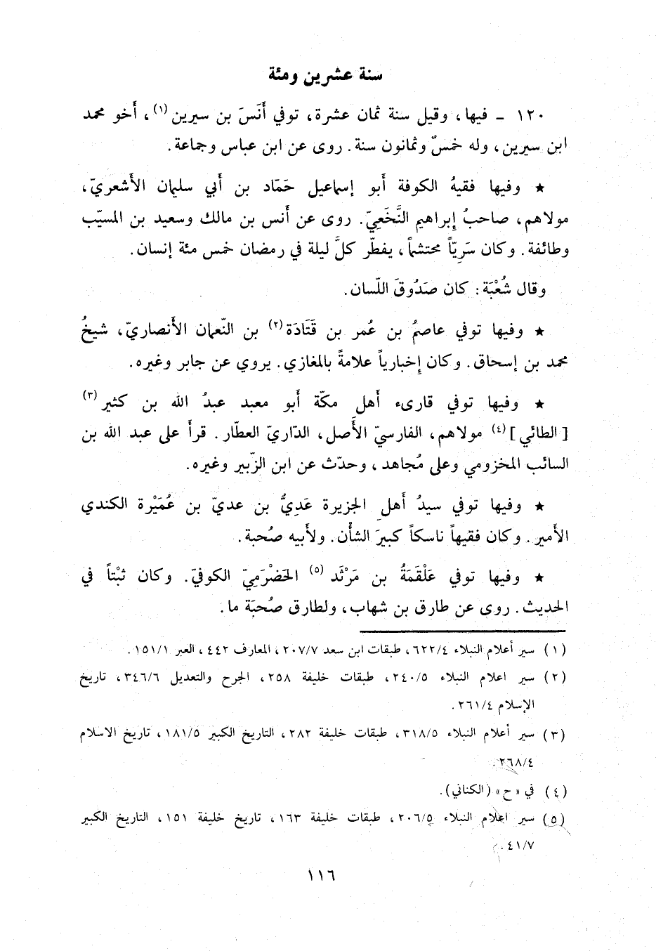 وفيها فقيهُ الكوفة أبو إسماعيل حماد بن أبي سليمان الأشعري، مولاهم. صاحبُ إبراهيم النخَعي. روى عن أنس بن مالك وسعيد بن المسيب وطائفة. وكان سَرياً محتشماً، يفطر كل ليلة في رمضان خمس مئة إنسان.