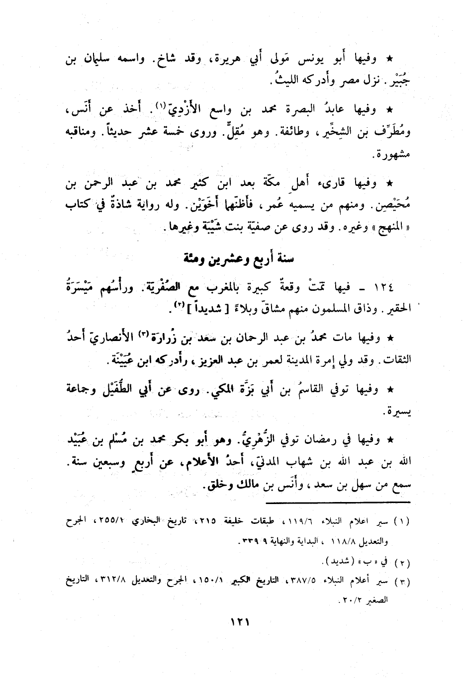 وفيها في رمضان توفي الزُهري وهو أبو بكر محمد بن مُسلم بن عبَيْد الله بن عبد الله بن شهاب المدني، أحد الأعلام. أربعٍ وسبعين سنة.