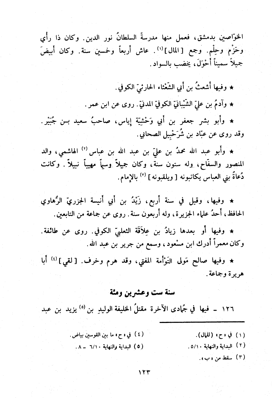 وأبو عبد الله محمد بن علي بن عبد الله بن عباس الهاشمي، والد المنصور والسفاح، وله ستون سنة، وكان جميلاً وسيماً مهيباً نبيلاً. وكانت دُعاةُ بني العباس يكاتبونه وِيلقبونه بالإِمام. وفيها، وقيل في سنة أربع، زَيْدُ بن أبي أنيسة الجزريّ الرّهاوي الحافظ، أحد علماء الجزيرة، وله أربعون سنة. روى عن جماعة من التابعين.