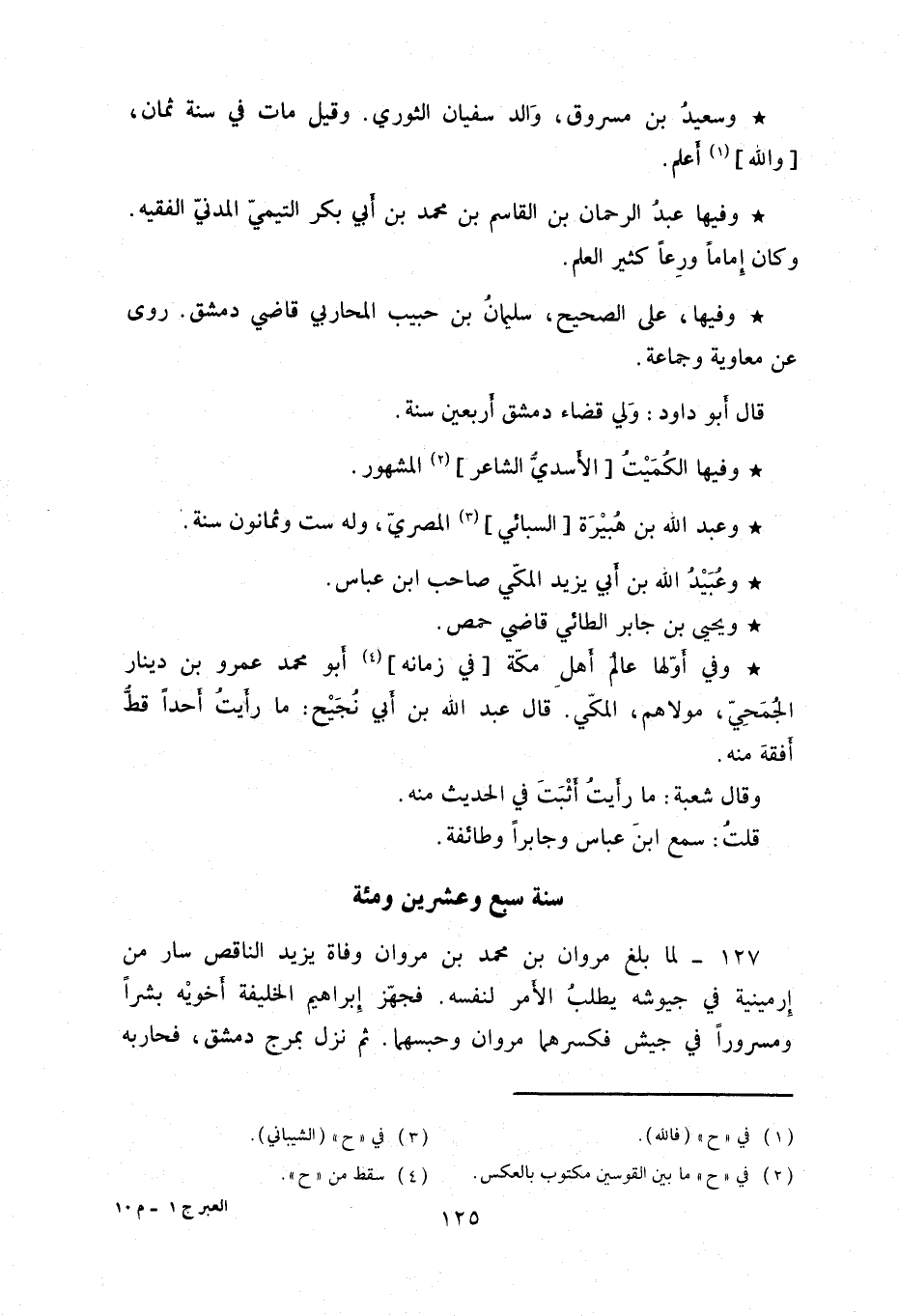 وفيها، على الصحيح، سليمان بن حبيب المحاربي قاضي دمشق. روى عن معاوية وجماعة. قال أبو داود: وَلي قضاء دمشق أربعين سنة.