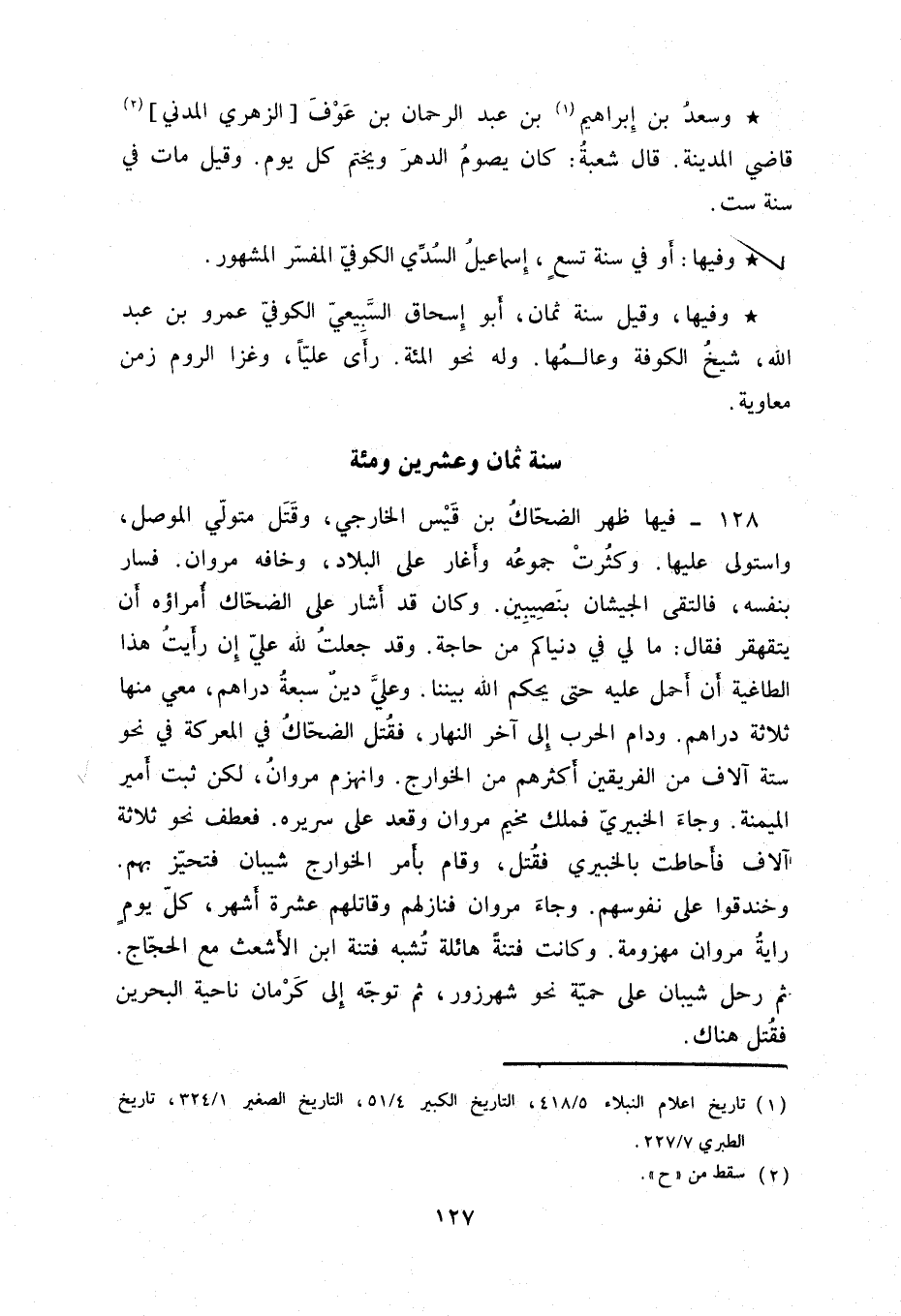 فيها ظهر الضحّاكُ بن قَيس الخارجي، وقَتل متولّي الموصل. واستولى عليها. وكثرت جموعه وأغار على البلاد، وخافه مروان. فسار بنفس، فالتقى الجيشان بنصيبين. وكان قد أشار على الضحّاك أمراؤه أَن يتقهقر فقال: ما لي في دنياكم من حاجة. وقد جعلتُ لله علي إن رأيت هذا الطاغية أن أحمل عليه حتى يحكم الله بيننا. وعلي دينٌ سبعةُ دراهم. معي منها ثلاثة دراهم. ودام الحرب إِلى آخر النهار، فقتل الضحاك في المعركة في نحو ستة آلاف من الفريقين أَكثرهم من الخوارج. وانهزم مروان، لكن ثبت أمير الميمنة. وجاء الخبيريّ فملك مخيم مروان وقعد على سريره. فعطف نحو ثلاثة آلاف فأحاطت بالخبيري فقُتل، وقام بأمر الخوارج شيبان فتحيّز بهم. وخندقوا على نفوسهم. وجاءَ مروان فنازلهم وقاتلهم عشرة أشهر، كل يوم رايةُ مروان مهزومة. وكانت فتنةً هائلة تُشبه فتنة ابن الأشعث مع الحجاج.
